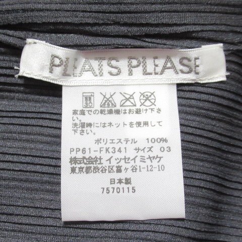 【商品説明】『一枚の布』というものづくりの考えを基に、新鮮な発想で身体と衣服の関係を探求している『イッセイミヤケ』。『西洋』でも『東洋』でもない衣服の本質と機能を問う『世界服』を創造。コンパクトに収納できて着る人の体型を選ばず、皺を気にせず気持ちよく身体にフィットします。・生地の厚さ:薄地・透け感:なし・伸縮性:あり・肩パット:なし【状態】中古品です。特筆するダメージはなく、全体的にキレイな状態です。多少の毛羽立ちや目立たない程度のダメージはご了承ください。【サイズ】3・着丈 56cm・肩幅 27.5cm・身幅 35cm・袖丈 56cm◆ISSEY MIYAKE プリーツプリーズ参考サイズサイズ1:T150~155cm B80cm W60cm H86cmサイズ2:T156~160cm B82cm W62cm H88cmサイズ3:T161~165cm B85cm W65cm H91cmサイズ4:T166~170cm B89cm W69cm H95cmサイズ5:T171~175cm B93cm W73cm H99cm【カラー】紺 グレー系【素材】素材タグ画像参照【仕様】---【付属品】なし【商品番号】1571_7【注意事項】※商品の状態、色味などは当店の判断によるものです。※あくまでも中古品につき、些細なダメージや見解の相違による返品はお受けできません。※サイズはすべて平置きでの実寸です。多少の誤差はご了承ください。※気になる点がございましたら、入札前にお問い合わせください。※お取引に関する詳細はストア情報でご確認ください。こちらの商品は【ネコポス】での発送が可能です。※ポスト投函・簡易包装での発送・日時指定不可・同梱不可。※紛失・破損に対する補償金額は3,000円(税込)まで。予めご了承の上、ご選択ください。
