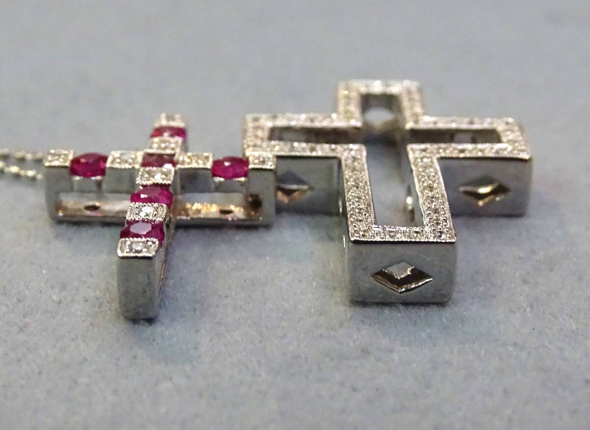 ♪【二重・2Way・セット】【十字架】ペンダント・ネックレス!【K18WG】製の【十字架】の大小の【セット:ペンダント】大きい十字架は、輝きの良い、上質【天然ダイヤモンド】を埋め込み、小さい十字架は、最高カラー!上質!天然【ルビー】【天然ダイヤモンド】入り。大きい十字架に、ルビーの十字架がスッポリと入り、2つ【SET】でも【単独】でも楽しめます!レア・希少・貴重なペンダントを、ご自分へのご褒美に、またプレゼントにも、この機会にどうぞ!