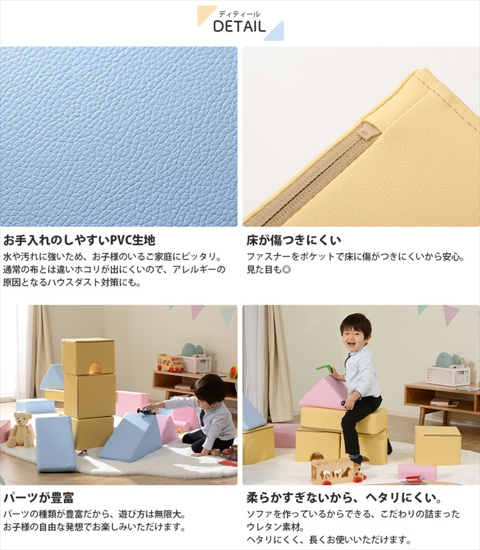 | 自分で作って遊ぶから「考える」 子供の自由な発想力、想像力をはぐくむ積み木クッション。 おうちでもたくさん体を動かして遊んでいただけます。 ソファを作っている会社だからごだわった「へたりづらさ」と「安心」の製品です。 生地はお手入れしやすいPVCを使用。 水や汚れに強く、お手入れがしやすいのでお子様のいるご家庭にぴったり。 ファスナーをポケットに入れ込むことで床に傷がつきにくく安心&見た目も◎ |