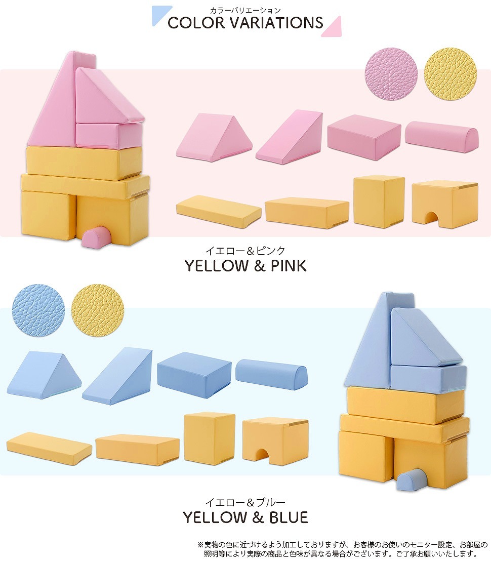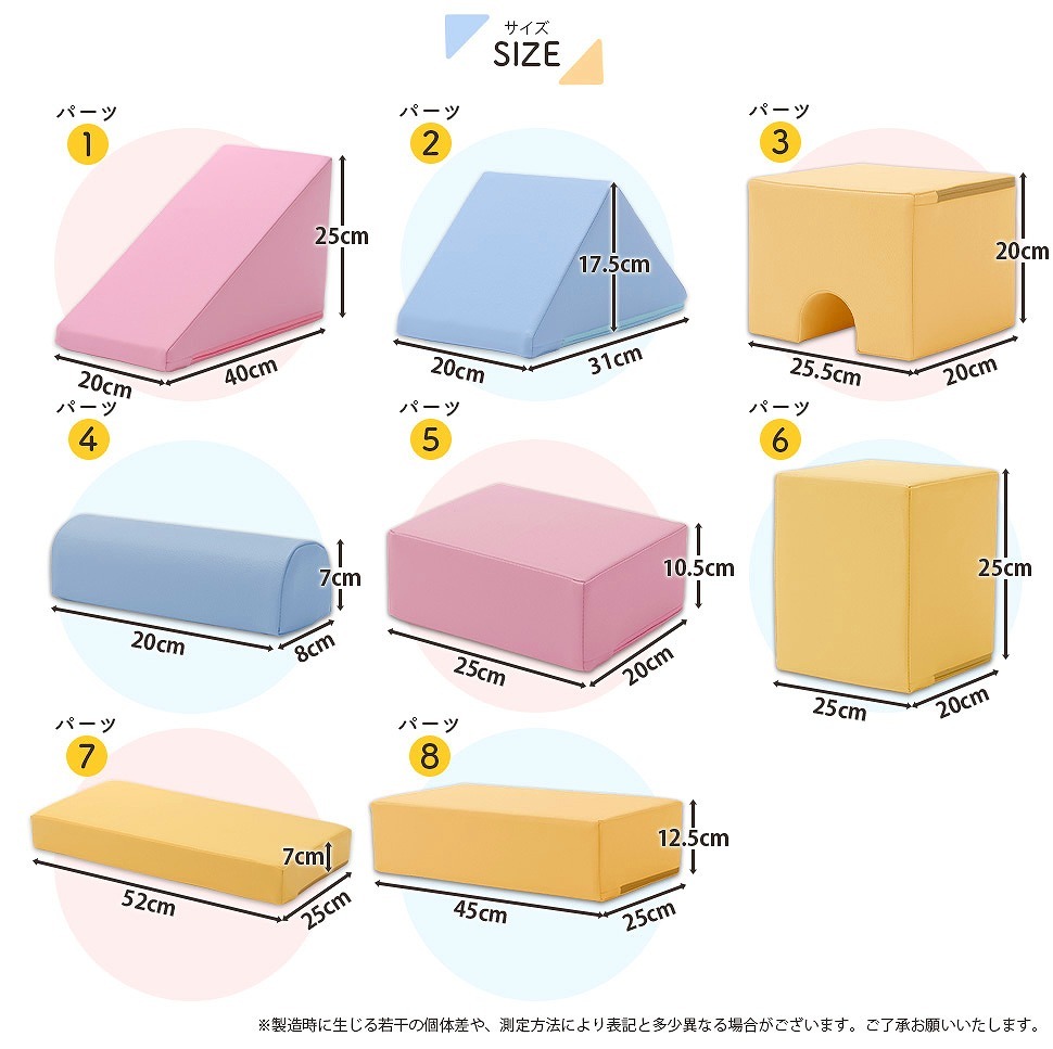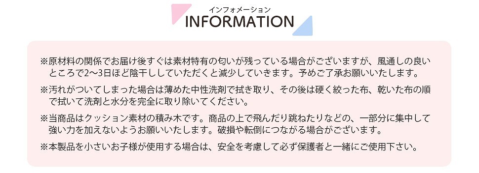 | ・自由な発想と想像を育む、クッション素材の積み木。 ・クッション素材なので、安心して遊んでいただけます。 ・PVC生地で、水や汚れにも強くお手入れ簡単。 ・お子様部屋、幼稚園、商業施設のキッズスペースなどにおすすめ。 ・安心安全の日本製。 |