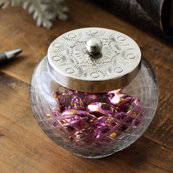 切子硝子のようなエッチング加工や ホワイト真鍮に型押しなどを施した 蓋付きのガラスの小物入れ コロンとした愛らしいフォルムや 真鍮ならではの鈍い輝き、ガラスの瑞々しさなど 素材の特長が生きたデザインは 何も入れなくても空間のアクセントになる 華やかさを持っています コットンやメイクスポンジなどを入れてドレッサーで。 キャンディーやポーションなどを入れて おもてなしのシーンにも似合いそうです 商品名 : ガラスの蓋付きエレガントBOX 商品番号 : ras9454 全体のサイズ(cm) : 直径10×高さ10 内寸 : 口径6.3×深さ8.2 材質 : ガラス 真鍮 重量 : 300g 生産国 : インド ※蓋は密閉ではありません ※商品の特性上、小さな欠け、擦り傷や隙間、がたつき等はご容赦ください ※ディスプレイによる色の違いはご了承下さい |