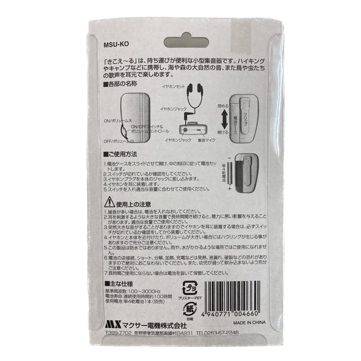 「きこえ~る」は持ち運びが便利な小型集音器です。ハイキング や キャンプ などに携帯し、海 や 森 の大自然 の音、また、 鳥 や 虫 たちの歌声を耳元で楽しめます。【主な仕様】基準周波数:100~3000Hz電池寿命:連続使用時間約100時間使用電池:単4乾電池×1本(別売)