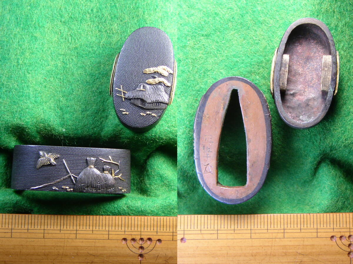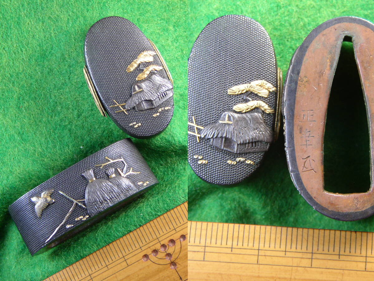 この度の縁頭の「田舎風景図(銘・正幸(花押)」は当方が「日本美術刀剣保存協会」に「保存審査」を依頼して「保存刀装具鑑定証(銘・正幸(花押))」を取得しましたので「正真保証」です。