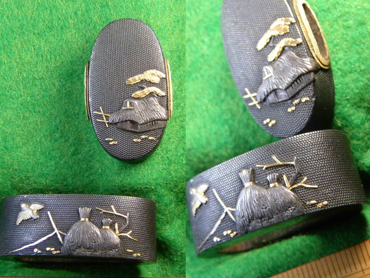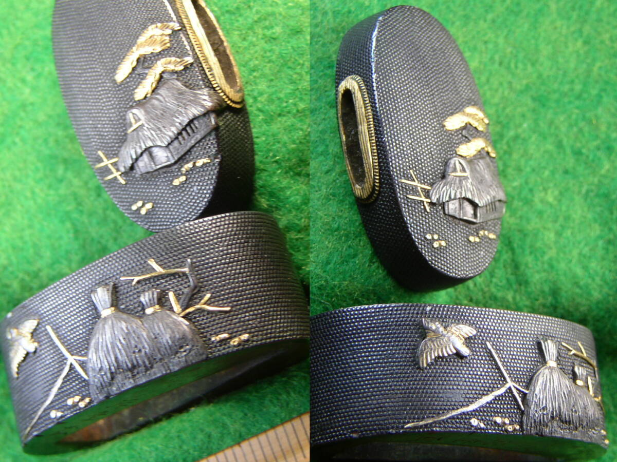 この度の縁頭は若干「肉厚」で誠に珍しい「黒四分一地(黒朧銀)」の「地金」に誠に趣ある「田舎風景の図」細かに「高彫・毛彫」し「極細密」の「魚々子」は一粒一粒を誠に入念に打ち込んであり