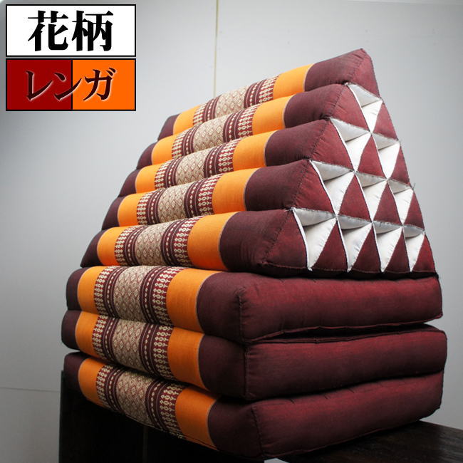 スタンダード 三角枕5段+マット3 (タイの伝統的な刺繍デザイン) インテリア雑誌の「デザイナーのお部屋紹介」などに登場する三角形のまくらのようなクッション。あれは【三角枕】と言う商品なのです。昔、農民が休憩用に寄りかかれる大きなまくらを作った事が三角枕の始まりです。「以前宿泊したホテルで見たことがある!」という方もいらっしゃるのではないでしょうか。三角枕は肘掛クッション・背もたれクッションと大活躍の枕という名の三角形のクッションです。三角枕4段マット付きは、畳・フローリングの上など場所を選ばずお使いいただけます。 | |||||||||||