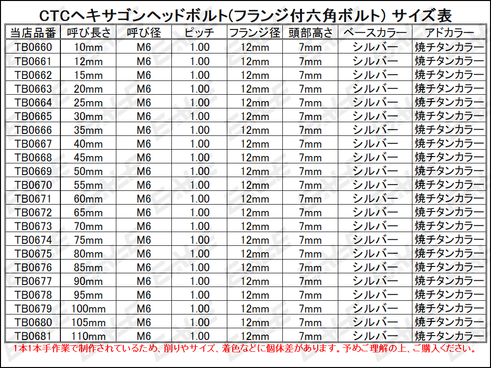 M6 CTCヘキサゴンヘッドボルト (フランジ付六角ボルト) 丁寧に削り出されたボルトは、ステンレスの地の色を活かした美しい仕上がりで、特にヘッド部分は肉抜きと穴あけ加工を施し、特殊な方法で焼チタンカラーを再現した、普通のボルトにはないオリジナルな仕上がりです。 ステンレスを使用しているので強度も十分にあり、クランクケースをはじめとするエンジン周りなどM6が使用されている場所なら色々な箇所に使用して頂けるよう各種サイズを用意しました。 ※出品は右記およびタイトルの“呼び長さ”“カラー”です。 ご落札後の変更はお受けできませんので必ずご確認下さい。 他の呼び長さは⇒ こちら 同デザインで違う呼び径・呼び長さ・カラーは⇒ こちら その他の六角ボルト・キャップボルトは⇒ こちら その他のボタンボルトは⇒ こちら その他のネジ(ビス・スクリュー)は⇒ こちら その他のナット・ワッシャーは⇒ こちら |