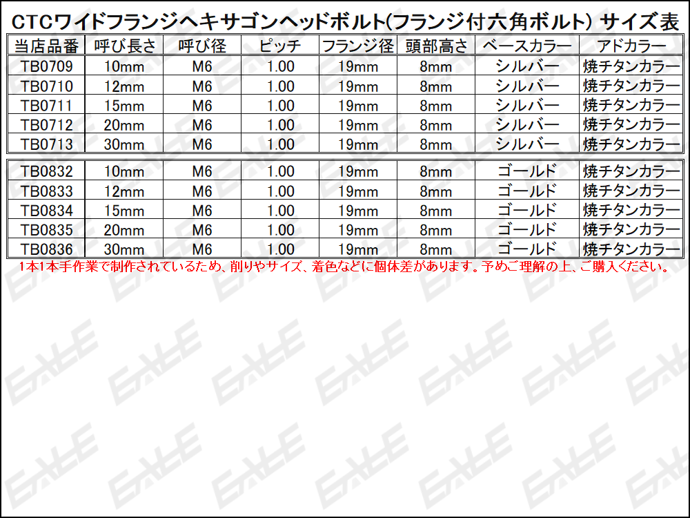 M6 CTCワイドフランジヘキサゴンヘッドボルト (ワイドフランジ付六角ボルト) 丁寧に削り出されたボルトは、ステンレスの地の色を活かした美しい仕上がりで、特にヘッド部分は肉抜きと穴あけ加工を施し、特殊な方法で焼チタンカラーを再現した、普通のボルトにはないオリジナルな仕上がりです。 ステンレスを使用しているので強度も十分にあり、広い座面で密着度を上げ、緩みを防止するのでM6を使用し、しっかりと固定したい場所に使用して頂けるよう各種サイズを用意しました。 また穴あけ加工されたヘッドはワイヤーロックが可能です。 ※出品は右記およびタイトルの“呼び長さ”“カラー”です。 ご落札後の変更はお受けできませんので必ずご確認下さい。 他の呼び長さは⇒ こちら 同デザインで違う呼び径・呼び長さ・カラーは⇒ こちら その他の六角ボルト・キャップボルトは⇒ こちら その他のボタンボルトは⇒ こちら その他のネジ(ビス・スクリュー)は⇒ こちら その他のナット・ワッシャーは⇒ こちら |