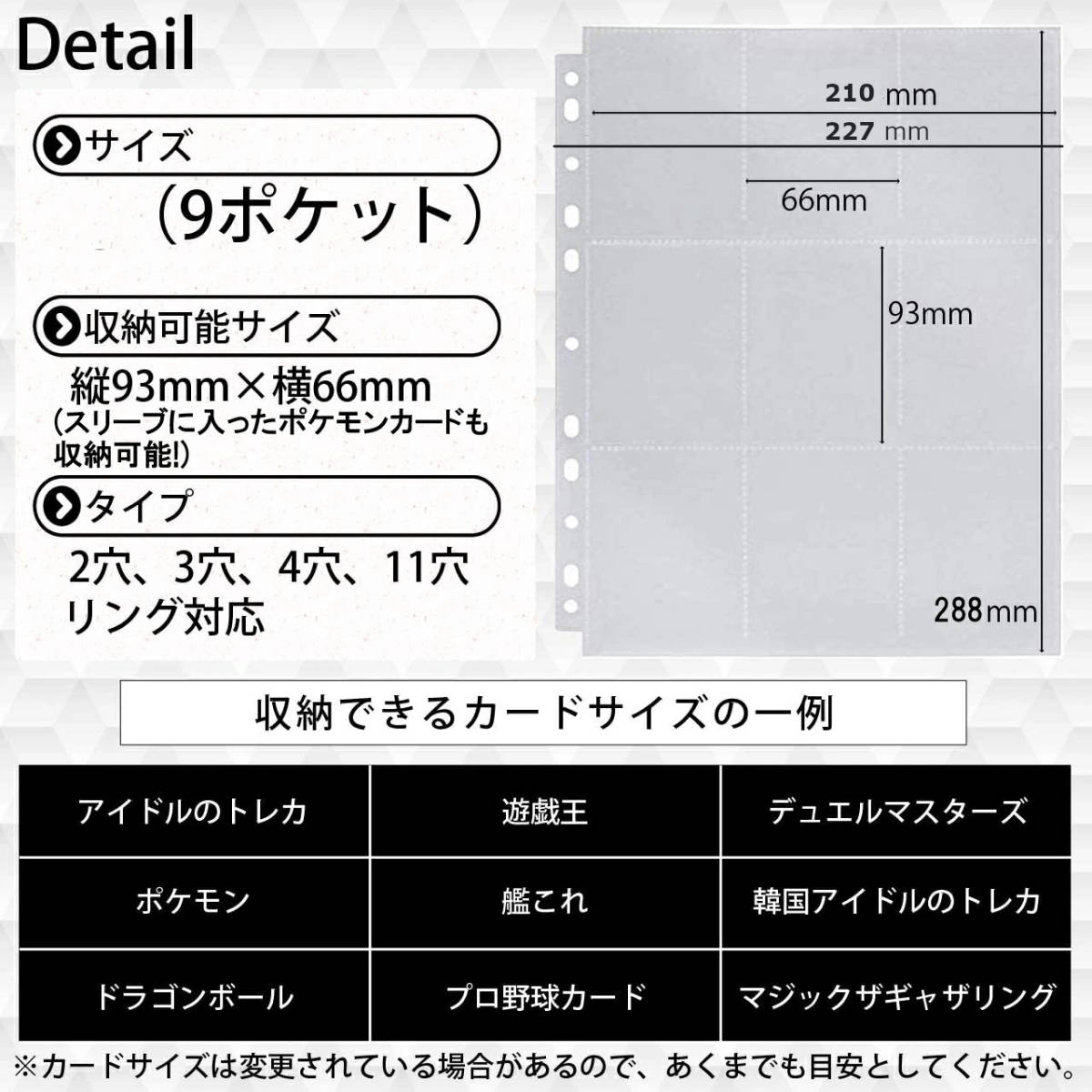 ※こちらの商品はトップからカードを収納するリフィルとなります。 サイドからカードを収納するリフィルも販売しております。 ※製造工程上リフィル本体に擦れや、稀に細かな傷などある場合がございます。 ご了承の上ご購入をお願い致します。 ※入荷時期によりパッケージの仕様が画像と異なる場合がございます。 【トレカやカードゲームの収納に】 容量・透明度・厚み・質感にこだわり抜いた9ポケットリフィル! しっかりと保護しつつも、光沢感が上品なのでコレクションカードが より一層美しく鑑賞できると大人気です。 スリーブに入ったポケモンカードをそのまま収納できます。 防水・UVカットを施したリフィル、水や紫外線から大切なカードを保護します。 大切なコレクションを高透明なファイル越しにクリアに眺められちゃいます! 程よい厚みとコシもあるのでめくりやすいですよ! 多くのバインダーと互換性のあるマルチ穴タイプ(2穴、3穴、4穴、11穴リング対応)の 9ポケットシートなので、様々なバインダーでお使いいただけます。 【皆様のお声を形にしました】 透明度と耐久力を両方兼ね揃えたものが欲しい、 色々なトレカやカードを収納したい、 リフィルの耐久性がもっとほしい・・・ そんなお声にお応えすべくサイズはもちろん 透明度や質感厚さまで使いやすさと保管のしやすさをこだわりました! 背中合わせに2枚重ねて入れることで、両面18ポケットシートのようにもお使いいただけます♪ ※中段、下段は片面からしか出し入れできません。 【おススメの収納カード】 遊戯王 / デュエルマスターズ / マジックザギャザリング ( MTG ) / 韓国アイドルのトレカ / 艦これアーケード / ヴァンガード / ポケモンカード / アイカツカード / ドラゴンボール / プリキュア / ファイアーエムブレム / ウィクロス / オーナーズリーグ / プロ野球カード / アニメ・アイドル・キャラクターカード などの保護・保存に使えます。 ※できるだけ多くのサイズに適合できるよう設計しておりますが、 すべてのカードサイズが収納できるわけではないのでご注意ください。 トレーディングカードサイズ目安 当商品のポケットサイズ 横 66mm × 縦 93mm ・ポケモンカードのサイズ 目安:横 63mm×縦 88mmm ポケモンカードをスリーブに入れたサイズ 目安:横 66mm×縦90~92mm ※ご使用のスリーブメーカーによってサイズが異なるため、 ご購入前に必ずサイズをご確認ください。 ・遊戯王カードのサイズ 目安:横 59mm×縦 86mm ポケモンカードをスリーブに入れたサイズ 目安:横 62mm×縦89~90mm ※ご使用のスリーブメーカーによってサイズが異なるため、 ご購入前に必ずサイズをご確認ください。 |