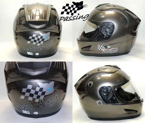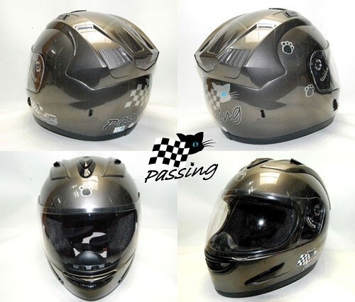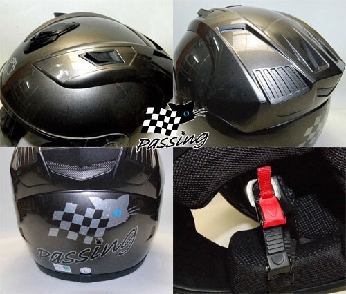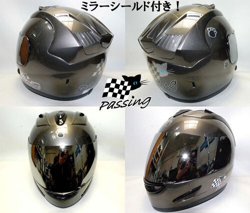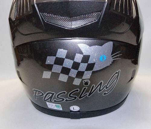 黒猫キャラクターブルーアイちゃんのパッシング・フルフェイスヘルメットです。 ■サイズは Mです。 ・Mサイズ57~58㎝・Lサイズ59~60㎝・XLサイズ61~62㎝がございますので変更も可能です。 【調整スポンジもお付けいたします。】 当店のオリジナルステッカーもプレゼント! ご希望でPassingの文字の部分をご希望のネームに変更出来ます。 【8文字まででご連絡をお願いいたします。】 キラキラのメタリック素材・屋外対応のステッカーで猫ちゃんとにゃんこ手形を上から剥がれにくい様にクリアーでコーティングもしてあります。 ■あご紐はワンタッチ式 ■内装は、取り外し可能で洗えます。 ■通気性を考えたベンチレーション機能付き ■SG規格適合品(全排気量対応) ★別売り2800円プラスで下記のシールドのお色も追加できますのでご連絡くださいませ。 【送料の方にプラスで追加可能です。】 ①ライトスモークシールド ②クリアーミラーシルバーシールド ④スモークシールド ⑤ミラーレインボーシールド ⑥ミラーシルバーシールド 【④~⑥は濃いめのお色となりますので夜間には見えにくいです。】