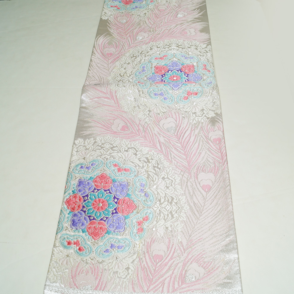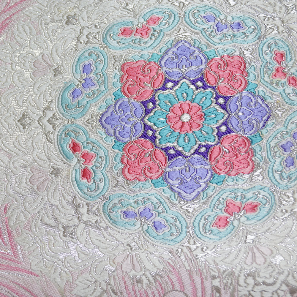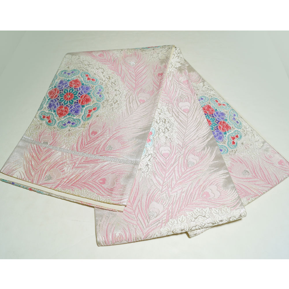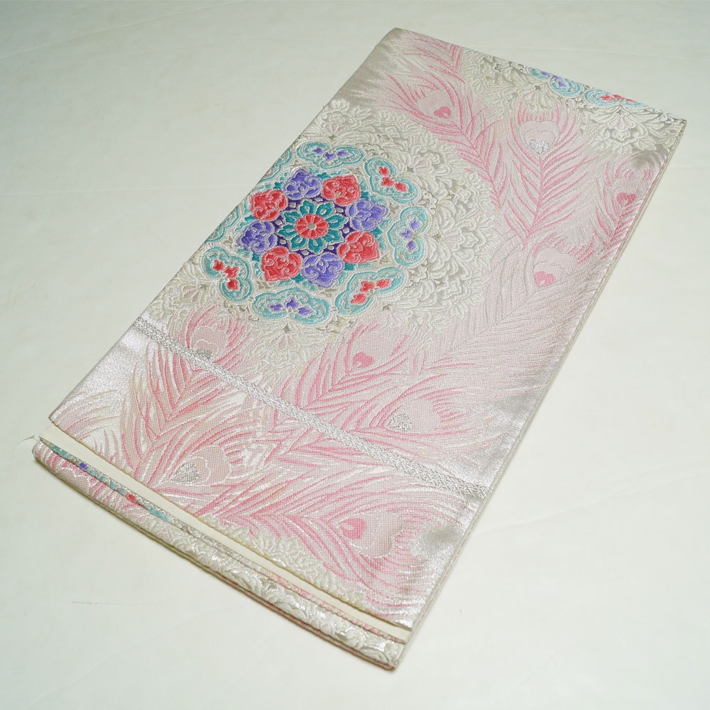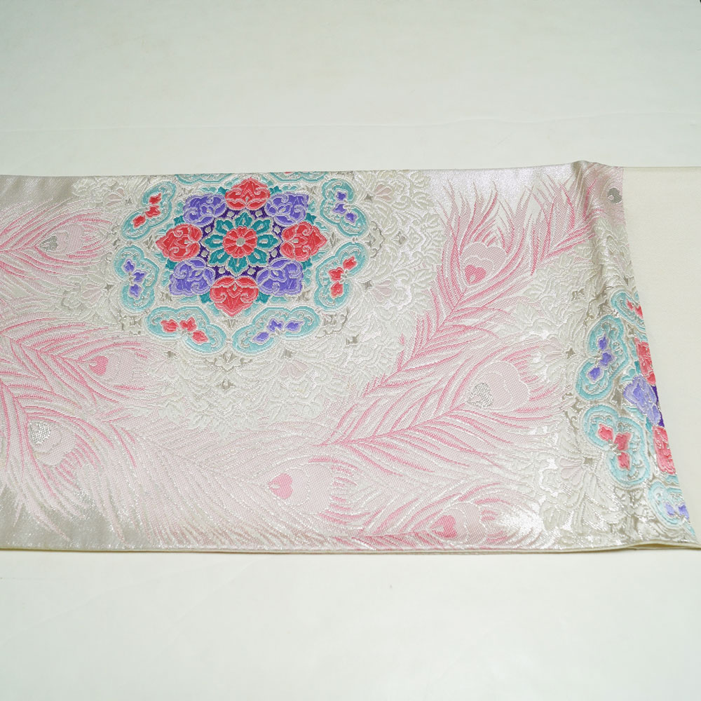 | 商品 説明 | 銀色系の地に華文に孔雀羽模様が織られた袋帯です。 |
