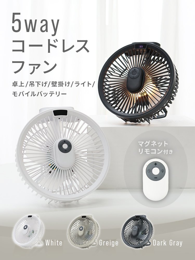 \5wayコードレスファン/ コードレスだから洗面台、キッチン、オフィス、アウトドア、キャンプ、BBQまで使い方いろいろ。 風量は弱~強、リズム風の4段階でお好みの調節が可能です。 また、タイマー機能付きだから就寝時にも便利。 マグネットリモコン付きで扇風機本体にくっつけて収納でき、紛失の心配がありません。 柔らかい電球色の3段階調光LEDライト機能付きで、読書灯やキャンプでのナイトライトとしてもす。 大容量バッテリーは、モバイルバッテリーとして使用することも可能。 バッテリー残量がLEDディスプレイに表示されるため、急なバッテリー切れで困ることもありません。 【商品詳細】 カラー:ホワイト、グレージュ 、ダークグレー サイズ:(約)18.9cm×18cm×7cm 重量:(約)380g バッテリー容量:4000mAh 充電時間:(約)5~6時間 【内容】 本体 ×1 リモコン ×1 USBケーブル ×1 取扱説明書 ×1 |