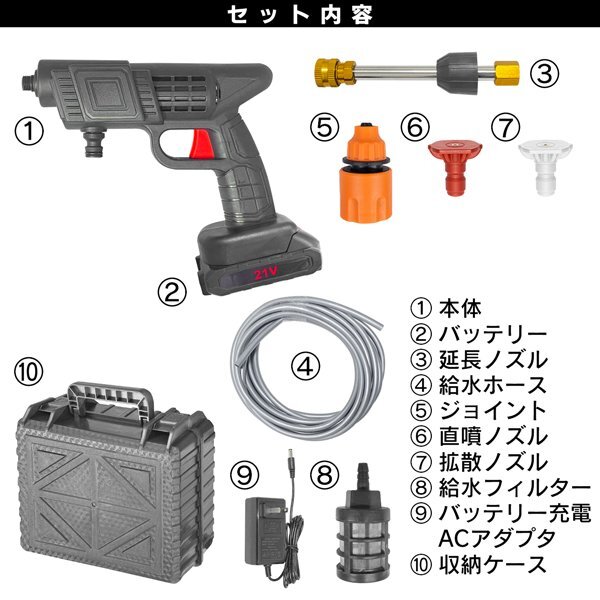 | セット内容 | 本体 延長ノズル 給水ホース ジョイント 直噴ノズル 拡散ノズル 給水フィルター バッテリー充電用アダプタ バッテリー 収納ケース |