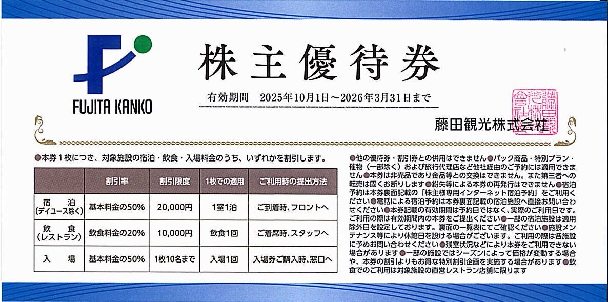 有効期間は「2026年3月31日」までです。 本券1枚で「宿泊」「飲食」「入場」のいずれか1つの割引をご利用いただけます。 宿泊は基本料金が50%割引(上限20,000円)、入場は基本料金が50%割引(10名様まで)になります。 一部施設では年末年始にご利用できない場合がございます。 ※詳細につきましては、画像やホームページの株主優待制度をご覧ください。 |