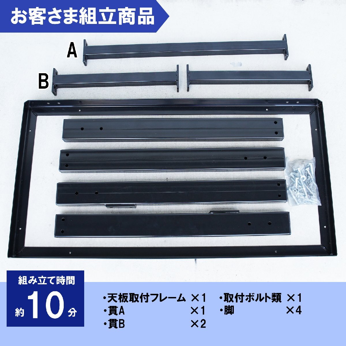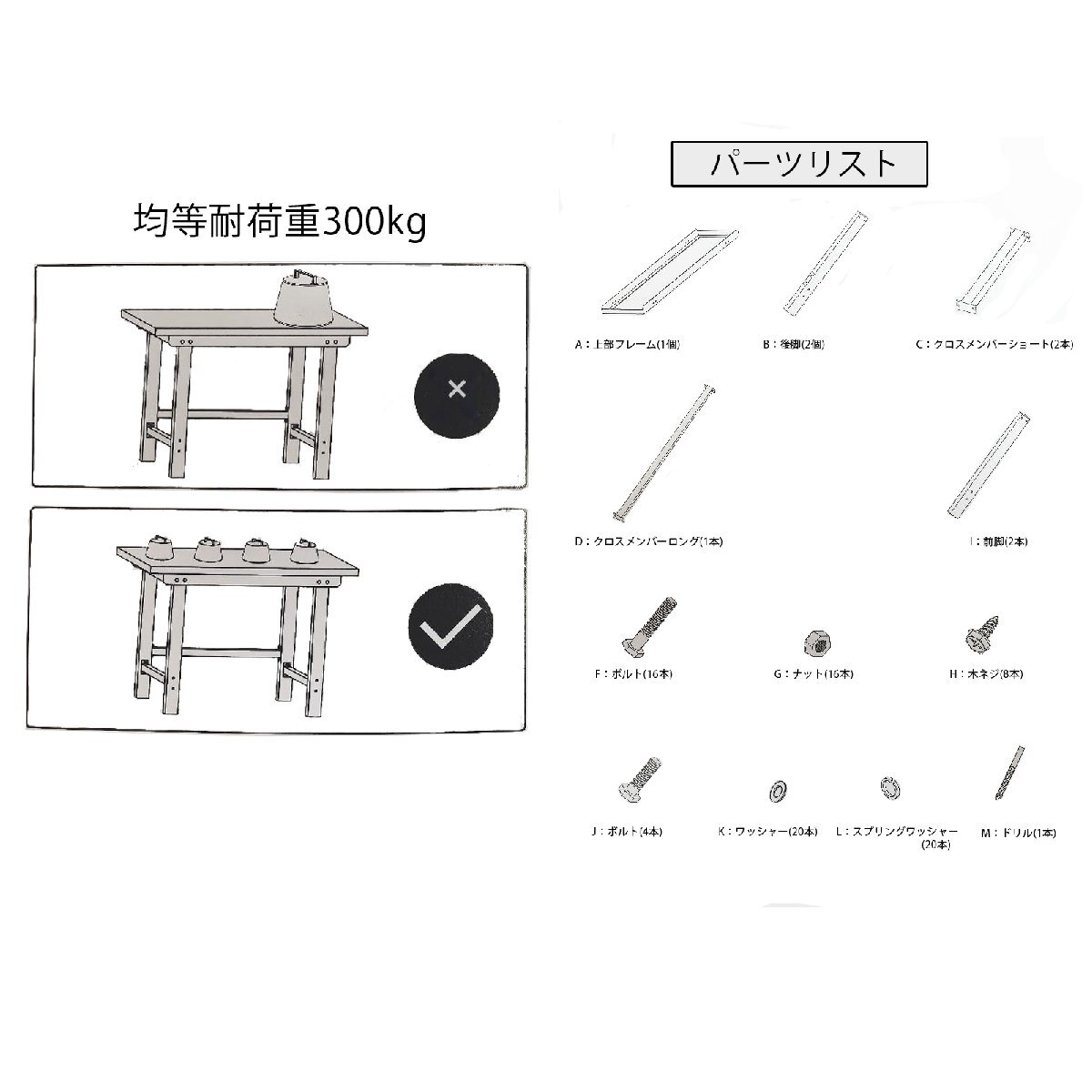 | 仕様 | 【本体サイズ】幅112×奥行57×高さ81.5cm 【本体重量】27kg 【脚部素材】鉄製 【天板までの高さ】8150mm 【均等耐荷重】300kg 【梱包サイズ】W115×H8×D60cm 【梱包重量】28.5kg 【付属品】天板固定ボルト×8個 |