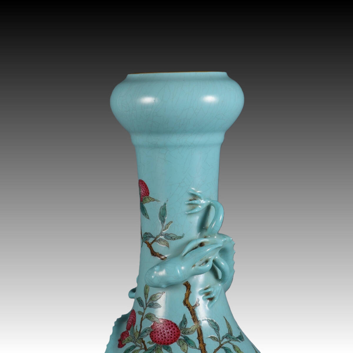 ◆御泓軒◆『清時代 陶磁器 松石緑地粉彩ライチ紋盤龍蒜頭瓶 清雍正御製款・箱付』極細工・古賞物・中国古玩・中国古美術