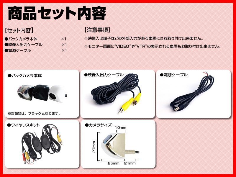 | ・バックカメラ本体 × 1 ・電源・映像ケーブル × 1 ・固定用両面テープ × 1 ・固定用ナット × 1 ・ワイヤレスキット × 1 |