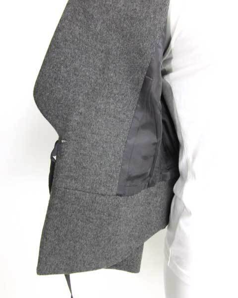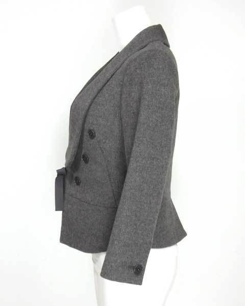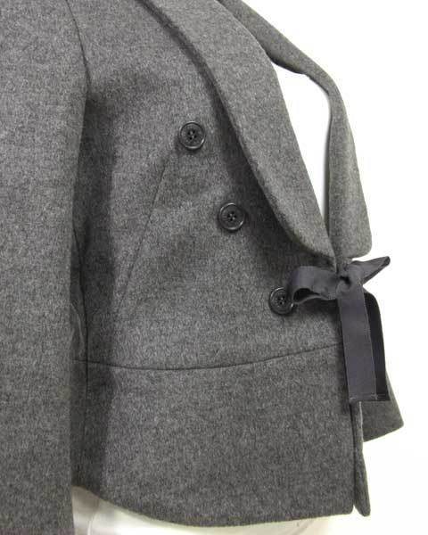 | 上質なお素材の変形ジャケット。絶妙なグレーカラーがお上品な印象です。ワンピースに合わせても好相性です。飾り釦になっていて、ホックとリボンで留めるデザインです。 |