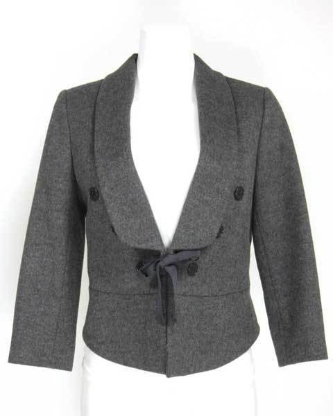| コメント | 上質なお素材の変形ジャケット。 絶妙なグレーカラーがお上品な印象です。 ワンピースに合わせても好相性です。 飾り釦になっていて、ホックとリボンで留めるデザインです。 |