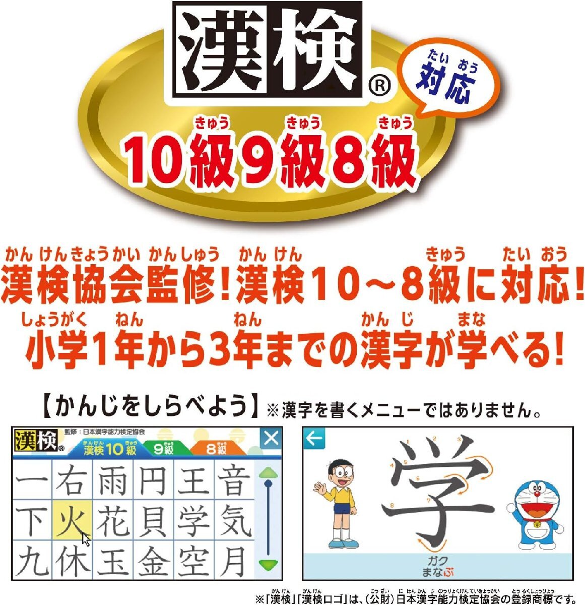 『ドラえもん』より、「ドラえもんラーニングパソコン」が登場! ドラえもんステップアップパソコンをリニューアル!動画プログラミングメニューや英語メニューの強化に加え、玩具初のホイール付きマウスなど「本格的なパソコン」をテーマにパワーアップしました。全54メニュー、総出題数は1700問以上! 動画プログラミングに加え、基本的なパソコンの操作が身につく6メニュー、かな・ローマ字入力のタイピングがばっちり身につく7メニューを搭載しています。漢字検定で10~8級に対応し、小学1年から3年までの漢字を学ぶことができます。 英語メニューでは、ネイティブスピーカーの発音でアルファベットや英単語を学べます。