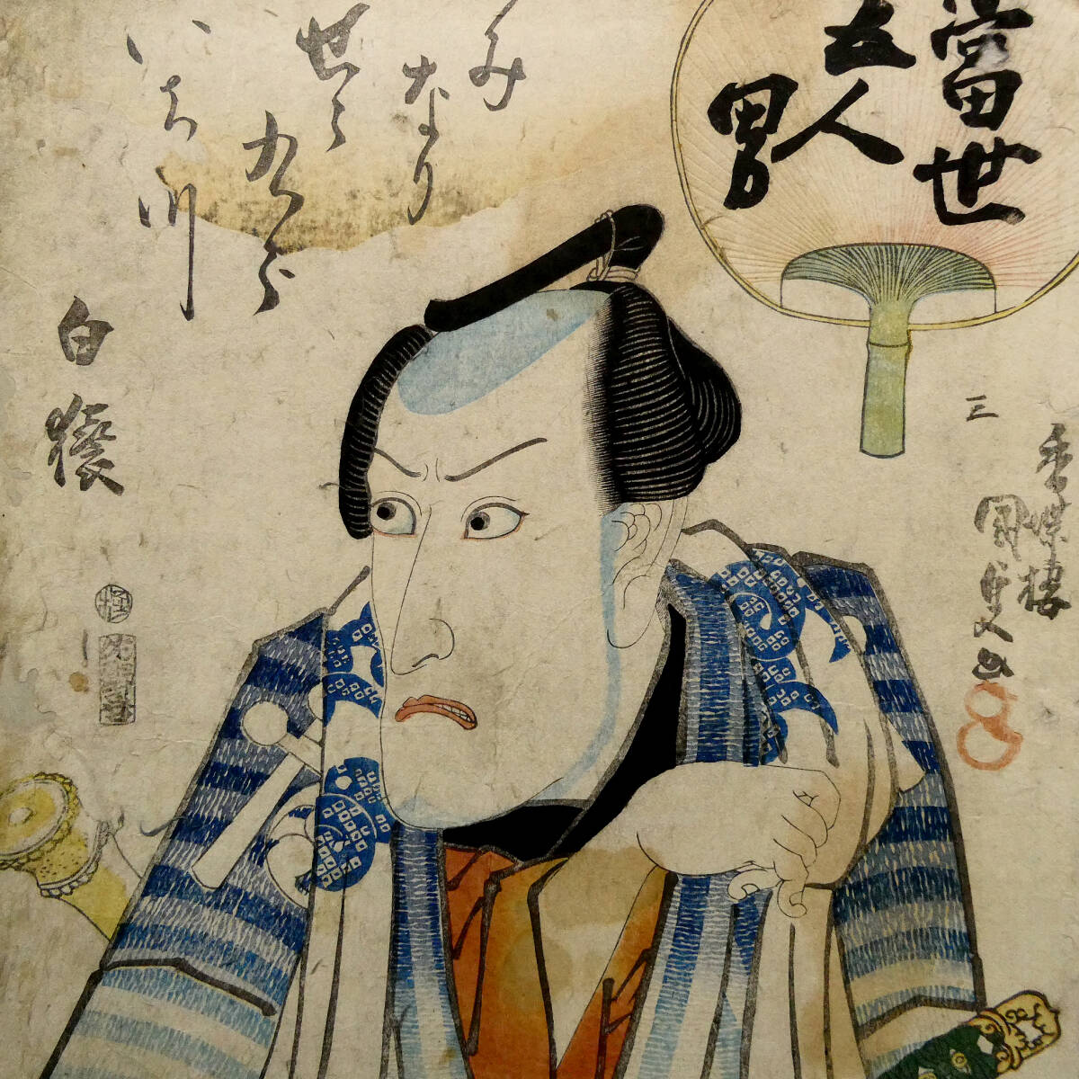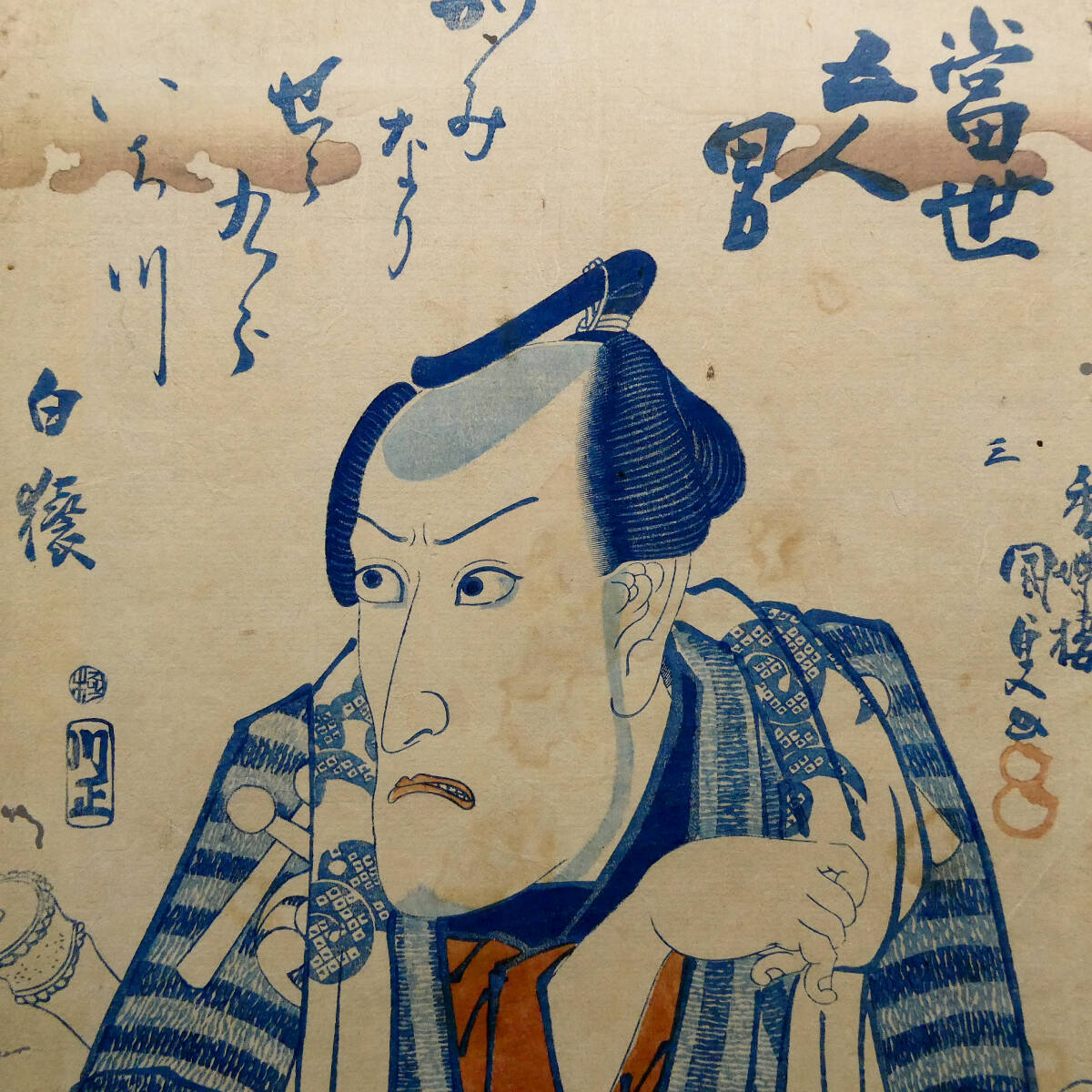■ 歌川国貞 江戸時代 木版浮世絵 「当世五人男」「かみなりせい九郎 いち川白猿」 藍摺絵 錦絵 2点一括 ■