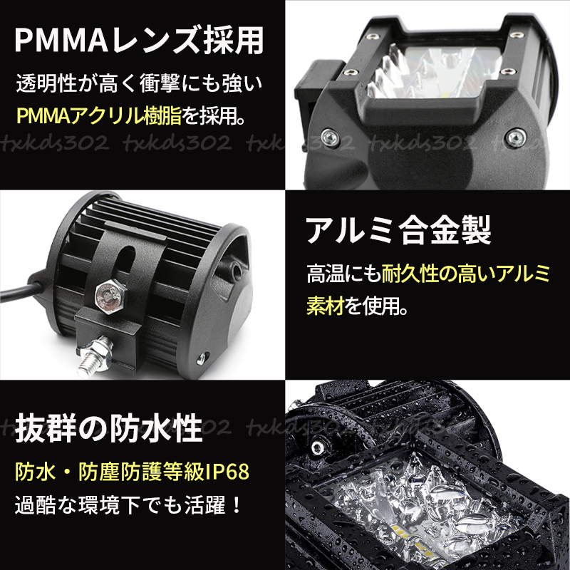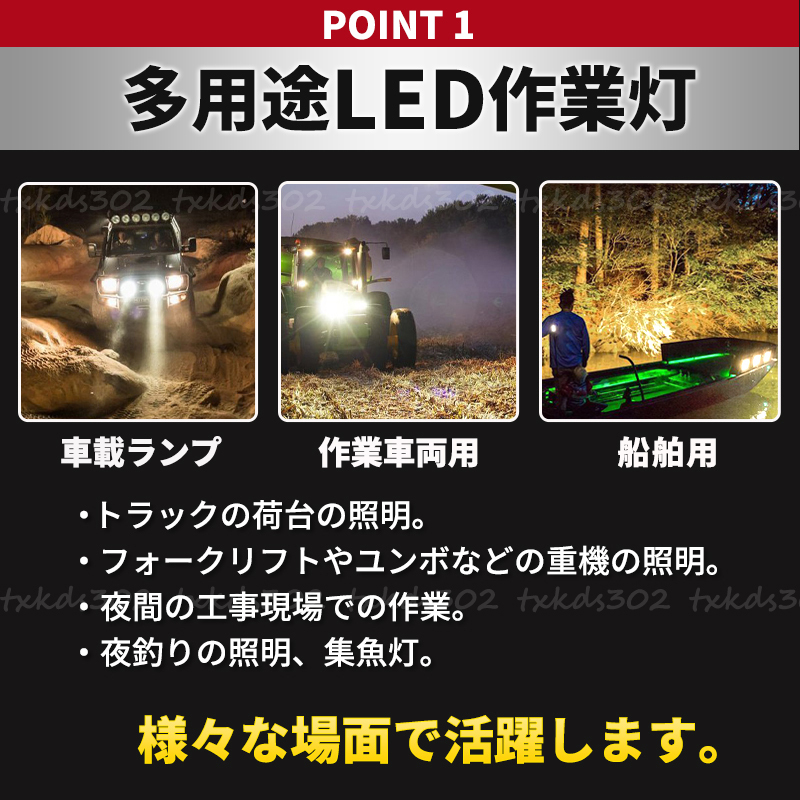 閲覧いただきありがとうございます。 ●屋内・屋外どちらにも使用可能! LEDワークライト 2個セットです。 広角・拡散タイプのライトで非常に明るく様々な場面で活躍します。 ・車の前照灯 ・トラックの荷台照明 ・重機や農業機械の夜間作業 ・船舶の照明や集魚灯として ・工事現場の作業灯に 白色の発光色で美しく照らします。 ●過酷な環境も大丈夫! 適応温度は-40℃~85℃まで。 防水性能は最高レベルの『規格IP68』 レンズ素材は透明度の高い『PMMA』 ボディはアルミダイカスト製で耐熱、放熱に優れ酸化処理をしています。 雨、洗車にも強い! バッテリーのプラス・マイナスに接続すればすぐに使用できます。 付属の取り付けステーでライトの上下角度の調整もできます。 【商品詳細】 サイズ : 96mm×80mm×60mm 発光色 : ホワイト(白) 消費電力 : 60W 動作電圧 : 8~32V ルーメン : 12000lm LEDバルブ寿命 : 50000時間以上 狭角30度 広角60度(コンポビーム) ※必ずサイズ(電圧)の確認をして下さい。 ※装着前にフィッテイングの事前確認。 ※取り付け説明・補助などはございません。 不安な方は専門業者にご依頼下さい。 全国送料無料 ■発送方法 レターパックプラス ご購入後2~3日で発送。 到着目安は 約2~3日。 |