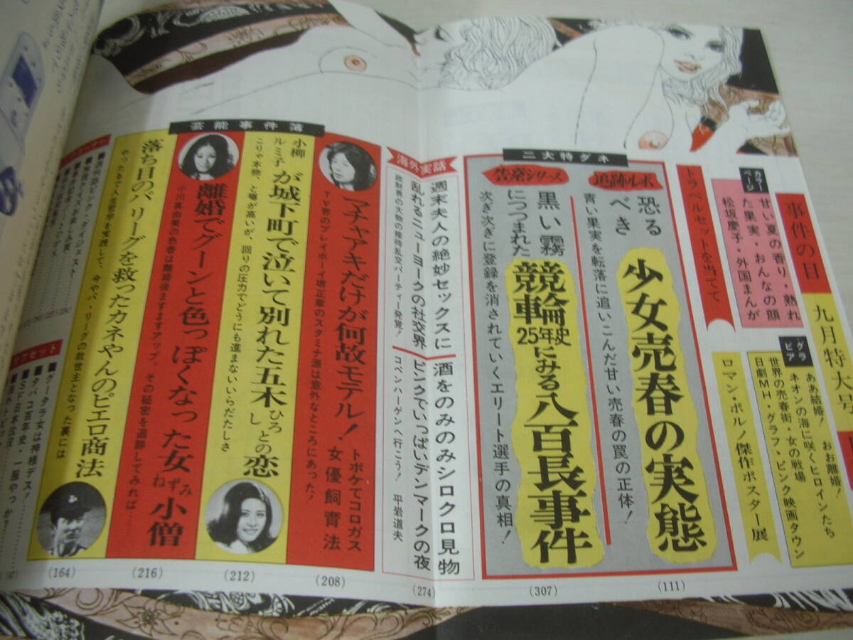 事件の目 1973年09月号 吉村理恵・3折ピンナップ サリー・ロウ コルベル ああ結婚、おお離婚 美女とヘビ 松坂慶子 ネオンの海に咲くヒロインたち 世界の売春街 劇画:花太郎呪文/原木亮 小柳ルミ子(記事) 小川真由美(記事)
