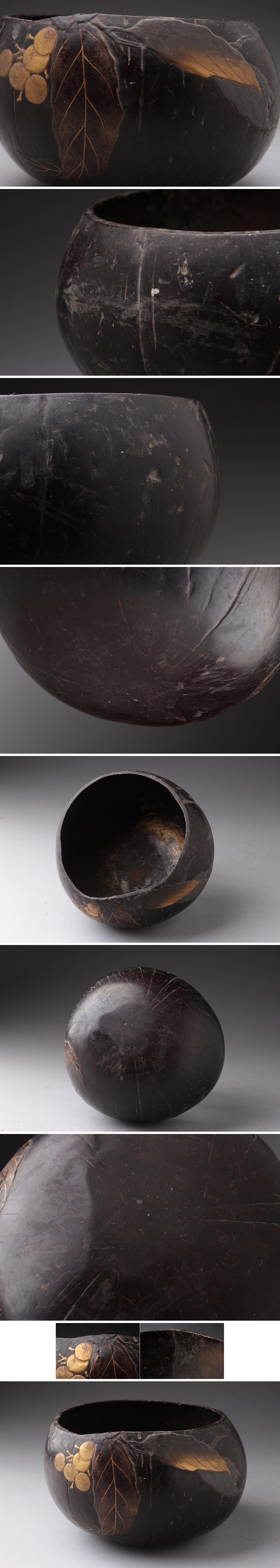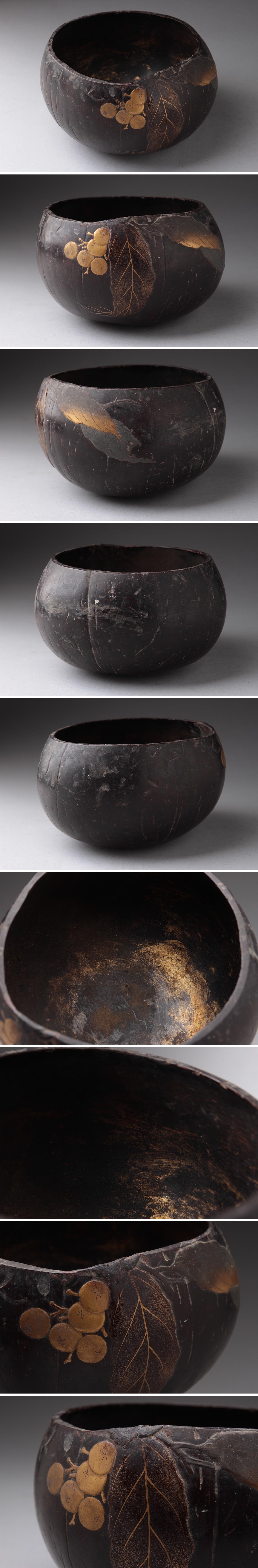 | ◆ 時代蒔絵 椰子殻 内金塗 草実高蒔絵鉢 幅14.3cm・椰子刳貫木実蒔絵椀・香炉・菓子鉢 茶道具 ◆