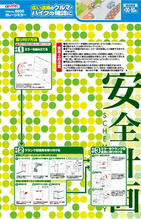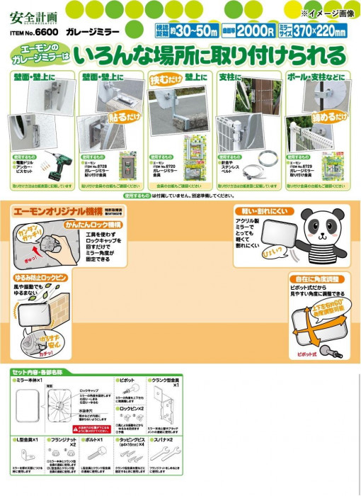 | 大きく映るからスピード感がよく分かる。軽くて割れにくい軽量樹脂製ミラー。別売の取付金具でいろんな場所にカンタン取り付けが可能です。約30~50mの遠距離を確認したい、遠くの車を大きく映したい、車・バイクなどのスピード感を確認したい、交通量が多くガレージからの出庫が大変。そんな方におすすめです。 工具を使わずロックキャップを回すだけでミラーの角度が固定可能。ゆるみ防止ロックピンで風や振動でもカチッと固定できます。 ※本製品にはアタッチメントは付属しておりません。別途、取り付け位置に合うアタッチメントをお買い求め下さい。 |