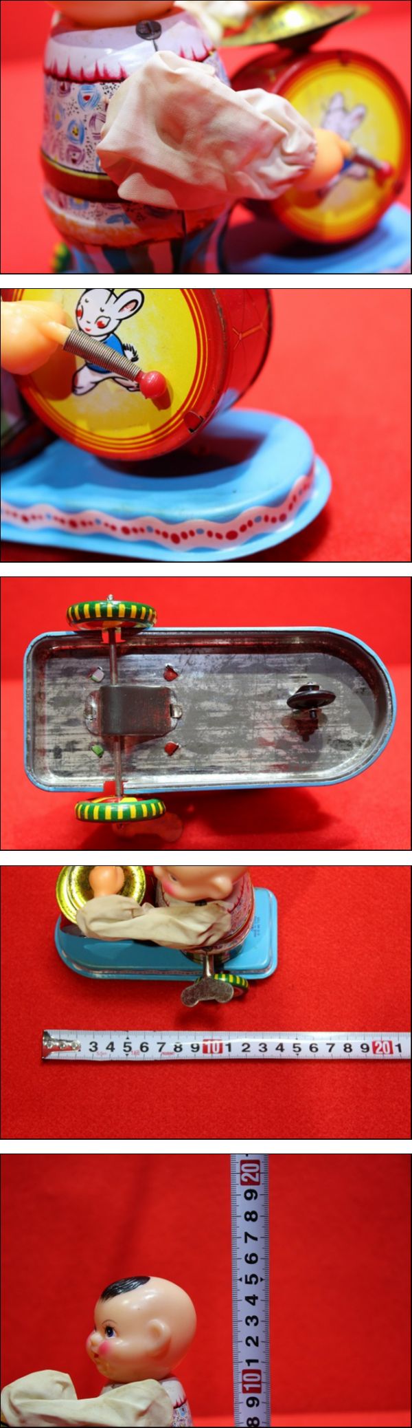 | ■□■□■ ご覧頂き誠にありがとうございます ■□■□■ レトロ 中国製 ブリキ ぜんまい玩具 です。 動作確認済。 ぜんまいを巻くと、右手で太鼓を叩き、左手でシンバルを鳴らしながら 三輪車のように前に進みます。 中古品となります。経年劣化による傷、汚れ、錆び等ございます。 状態は写真にてご確認ください。 [重量] 約200g [サイズ] 高さ 約15.5㎝ 幅 約9㎝ 奥行 約14㎝ [梱包時サイズ] 60サイズ(佐川急便) ※最少の梱包を心掛けておりますが、商品の安全の重要性により、 サイズが変わる事が御座います。予めご了承ください。 ※中古品であること、現状販売であることをご理解いただける方のみ 御入札をお願い致します。 ※個人保管・経年による汚れ、傷等が見られます。 ※当方専門知識がない為、質問にはお答えできない場合が御座います。 ※知識不足によるカテゴリ違いがある場合が御座います。予めご了承くださいませ。 【商品状態の目安】 D S…新品または未使用品 A…中古品 未使用品に近い物(非常に状態の良い物) B…中古品 目立った傷や汚れ無し C…中古品 やや傷や汚れが有り D…中古品 傷や汚れなどが有り使用感の有る物 E…中古品 全体的に状態が悪い物 F…中古品 ジャンク品(状態は写真にてご確認をお願いします) ※最少の梱包を心掛けておりますが、商品の安全の重要性により、サイズが変わる事が御座います。予めご了承ください。 ※画像は現物を撮影しておりますが、照度、遮光、モニターによっては実物と色目が異なって見えることがありますのでご注意ください。 ※写真に写っているものが商品全てとなります、御注意下さい。 【評価について】 基本的に当方から評価は致しません。 ※評価ご希望の方は、「受け取り連絡」を頂いた後、取引ナビにてご連絡ください。 | ||