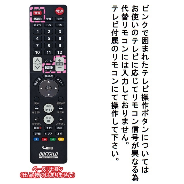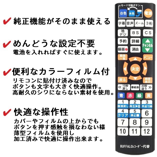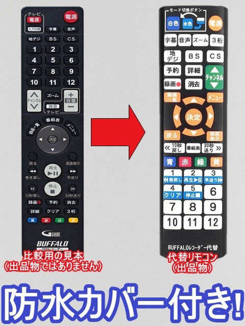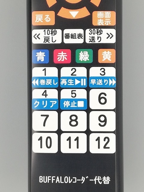 | 【商品名】 BUFFALO HDDレコーダー 代替リモコン 【対応機種】 DVR-S1C DVR-S1C2 メーカー出荷時に設定されているリモコンコード1にてプログラムしています。 【商品について】 右側の代替リモコンが出品物になります。左側のリモコンは見本画像です。 タイトル機種のリモコン信号を入力した設定不要ですぐ使える純正品と同等の代替リモコンです。 リモコン左上のモード切換ボタンにて、各機能のボタンをお使いいただけます。 テレビ操作用のボタンについては環境に応じて異なるため入力しておりませんので、お使いの テレビリモコンで操作してください。 商品に不具合があった場合は代替品交換かご返金にて対応させて頂きます。 【付属品について】 防水リモコンカバーをお付けします。 ボタン機能を印刷した薄型フィルムはリモコンに貼付け済みです。 乾電池は付属しません。別途ご用意下さい。(単4乾電池×2本) 【発送について】送料無料 迅速発送を心掛けております。土日祝日はお時間を頂く場合ございます。 ポスト投函配達となり、日時指定は出来ません。 | ||