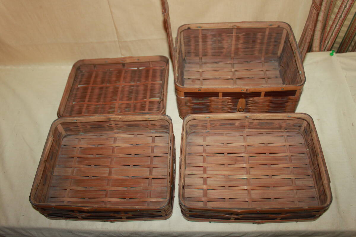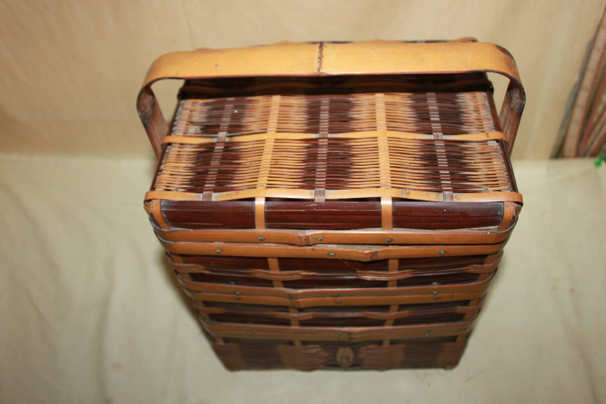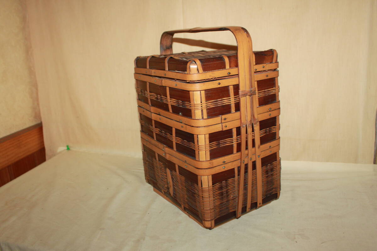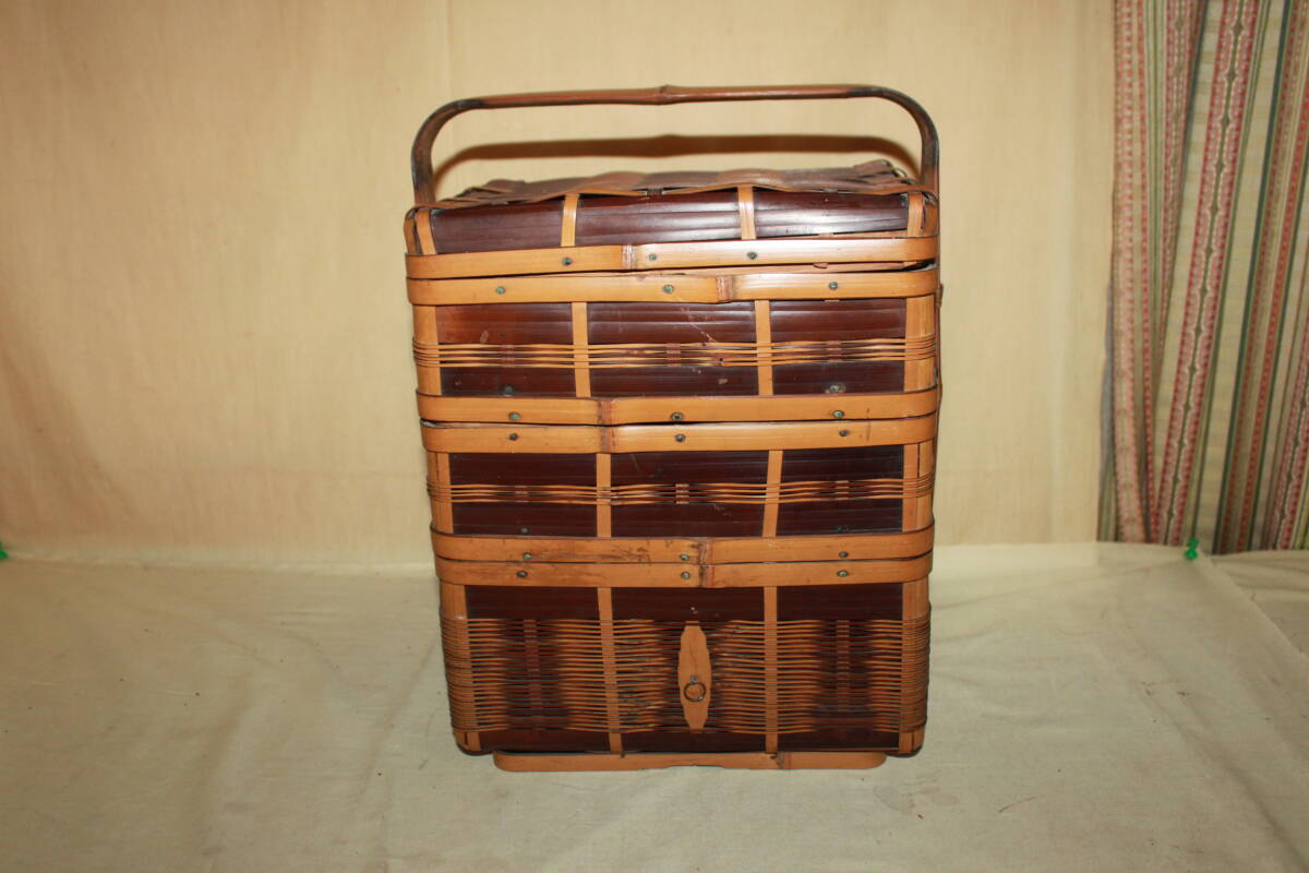 *商品説明* 古い3段竹かごです。 非常にしっかりとした作りで職人の確かな技術力を感じるひと品。 野菜や小物を入れておくのにちょうどいいサイズ。 安定感のある取っ手がついておりますので天井から吊り下げて空中の収納としても お部屋を古く味わいのある空間へと。 古いモノの味わいを感じる生活に。 ・中古 ・経年の汚れ、傷、擦れ、しみ、くすみ、などがあります。 ・蓋、各段の取り外しはスムーズにできます。 ・竹製です。 ・本体のみの出品となります。 その他の小物は付属いたしません。 ・古いモノですので完全な動作や状態を保証できません。 メンテナンス・修理が必要な場合落札者様でお願いします。 ・・・・・・・・・・ 取っ手含む高さ:約34.5cm幅:約27.5cm奥行き:約20cm ※素人採寸につき少々の誤差はご容赦ください。 ★当方、古いものを主体として出品させて頂いております。 点検は致しておりますが汚れや傷等の見落としがある場合がございます。 ご了承の上よろしくお願い致します。 ★発送詳細 ・佐川急便の予定です。 ★支払方法 ・!かんたん決済 他にも色々出品しています。よろしかったらご覧になってください。