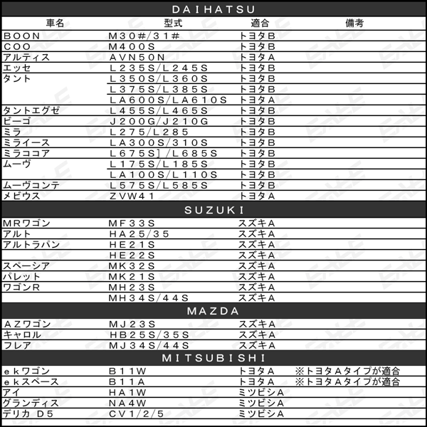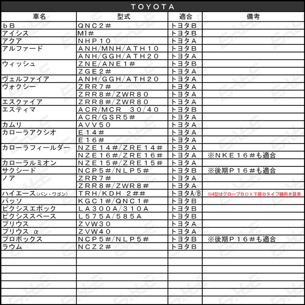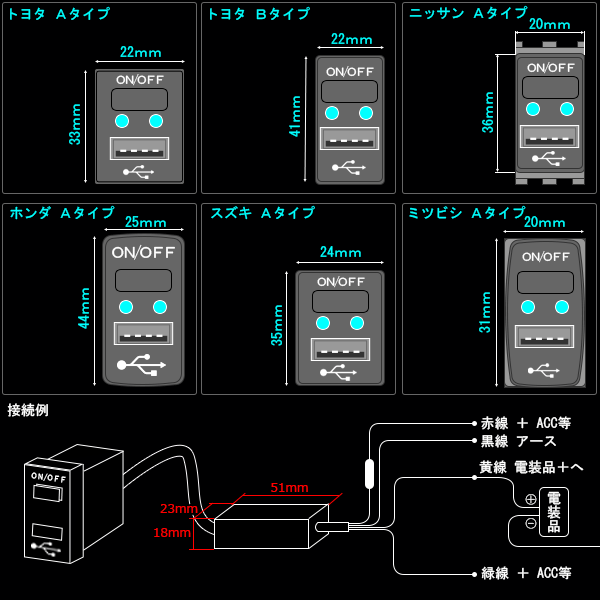 2in1 純正風 USB スイッチホールカバー トヨタAタイプ 容易に行えるUSB給電ポートと、電装品のON/OFFができる スイッチを増設 ブルーのLEDが点灯し、電装品の動作状態がひと目でわかるほか、夜間でもUSBの差し込み口が容易に見つけれます。 ■適合車種一例 NHP10 アクア 20系 アルファード/ヴェルファイア 30系 アルファード/ヴェルファイア 20系 ウィッシュ 70系 ヴォクシー/ノア 80系 ヴォクシー/ノア 80系 エスクァイア 50系 エスティマ 200系 ハイエース ZVW30 プリウス ZVW40 プリウスα 他メーカー対応品も取扱いしています。 トヨタA トヨタB ニッサンA ホンダA スズキA ミツビシA 適合表記載の車種であってもグレード、オプションの有無により取付が出来ない場合がございます。 記載車種は一例です。適合多数のため、取付可能かは製品サイズを目安にご判断下さい。 最新適合情報は下記をご覧ください。 |