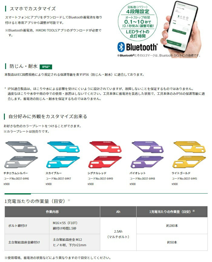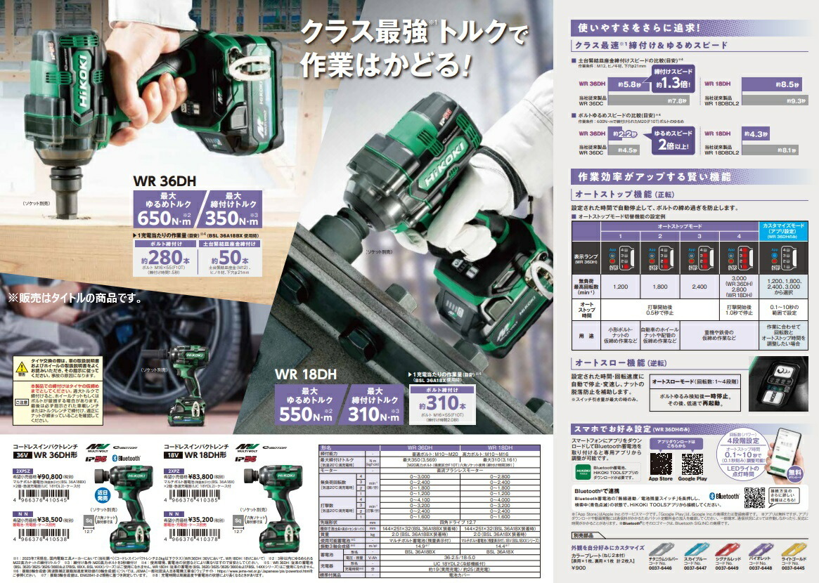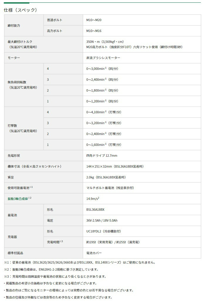 電池・充電器はその他機種のセット商品をバラシた商品です。説明書・外箱は付属しません。HiKOKI ハイコーキ(旧日立工機)コードレスインパクトレンチWR36DH(XPZ) バッテリBSL36A18X+充電器UC18YDL2付※ケースは付属しません。当店オリジナルセット品■クラス最速※1締付け&ゆるめスピード※1:2023年7月現在。国内電動工具メーカーにおいて(HiKOKI社調べ)(コードレスインパクトレンチ 2.0kg以下クラス、36V)■作業効率がアップする賢い機能・オートストップ機能(正転)・オートスロー機能(逆転)■防じん・耐水 IP56※※IP56適合製品は、ほこりや水による影響を受けにくいように設計されていますが、故障しないことを保証するものではありません。過度なほこりや水中や雨の中での使用・放置はしないでください。工具本体に蓄電池を装着した状態で、工具本体のみIP56の保護等級に適合します。蓄電池の防じん・耐水を保証するものではありません。■自分好みに外観をカスタマイズ出来るお好きな色のカラープレート(別販売品)をつけることができます。4966376410545496637641762945491152713404966376332236