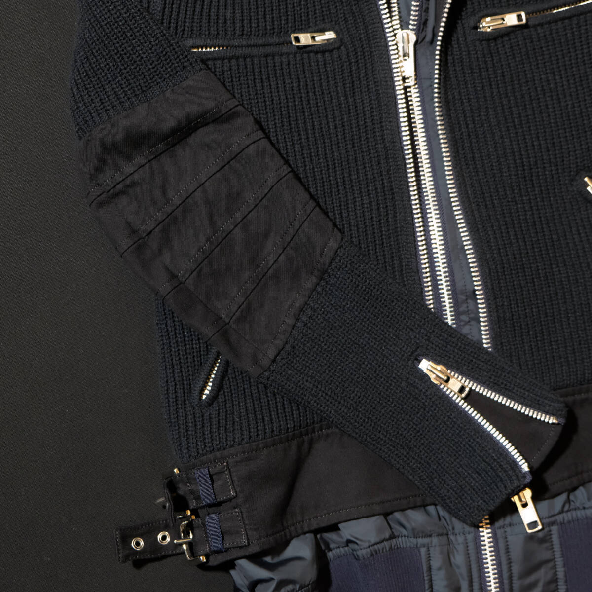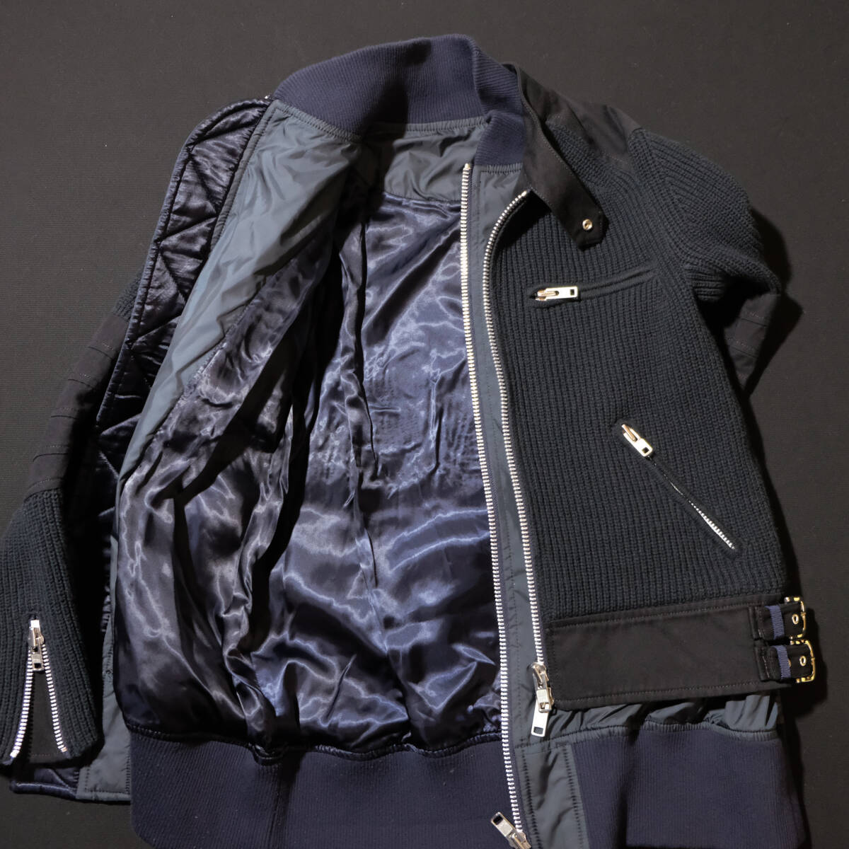 | 商品説明 | 【SIZE】 表記無し 【COLOR】 黒/ネイビー 【DISCRIPTION】 ニット素材とMA-1 フライトジャケットのドッキングライダースジャケット ニット側は黒、内側のフライトジャケット部分はネイビーカラーのレイヤードデザイン フロントジップはそれぞれダブルスライダー ウエストアジャスター付き サイズ表記、素材表記無し ライニングにシワあり その他汚れやダメージなくまだまだご着用いただけます。 |