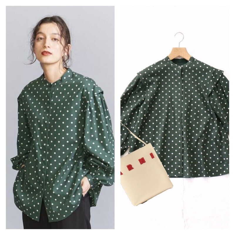 ・たっぷりとした袖ボリュームに、柔らかなポルカドットのバンドカラーブラウスです。