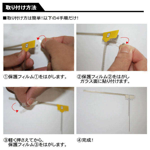 ~メール便発送可能!最新L型フィルムアンテナ&ケーブルセット~ 商品名:ケンウッド製ナビDAA-GP6用L型フィルムアンテナ右2枚左2枚&ケーブル4本セット 適合型式: ケンウッド DAA-GP6 最適な電波状態を保つため、ナビ型式別に電気的な調整を施しています。 上記適合型式以外での使用の場合、お問い合わせください。 商品番号:LF4DAA-GP6 適合コネクター:HF201S-01 弊社提携工場での製造のため、品質を落とさず、価格を極限まで落とすことに成功しました。 純正品ではありませんが、専門家監修により作成された製品ですので、御安心ください。 ブースター内蔵型で独自に最適なアンテナゲインを調整しています。 フィルムアンテナはエレメント部分だけ残るタイプを採用。 商品を厚紙に挟み、曲がらないように発送します。 ワンセグからフルセグまで、地デジに対応した機器の外部アンテナとしてご使用いただけます。 取付形状をよくご確認の上、お買い求めください。 ブースター内蔵型ケーブルの長さは約5mです。 大量購入をご希望の方は質問よりお問い合わせください。 よろしければこちらもご利用ください。 フィルムアンテナ https://store.shopping.yahoo.co.jp/tns/tns-film.html アンテナケーブル https://store.shopping.yahoo.co.jp/tns/tns-antena.html GPSアンテナ https://store.shopping.yahoo.co.jp/tns/tns-gps.html GPSプレート https://store.shopping.yahoo.co.jp/tns/tns-p-t.html 両面テープ https://store.shopping.yahoo.co.jp/tns/tns-ryomen.html GPSフィルムアンテナ https://store.shopping.yahoo.co.jp/tns/tns-g-f.html | ||