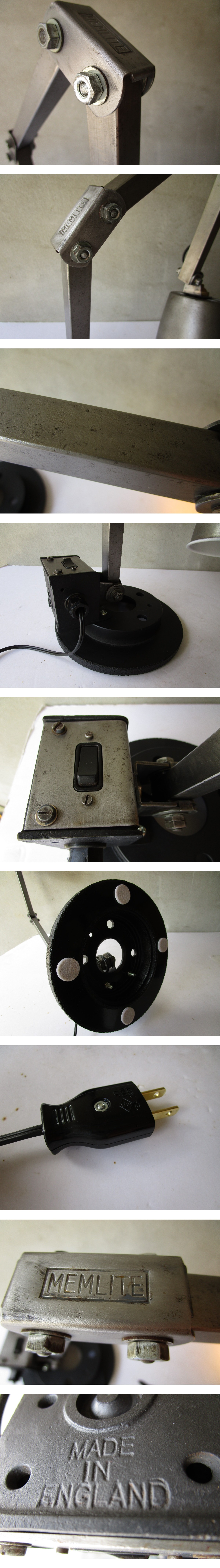 オリジナルペイントをすべてはがして、軽くクリアコートした品物で、角ハイプのアーム、スイッチBOXの形状等シエード以外は直線を基本にデザインされたフォルムは重厚感がありながらシャープで洗練された印象の1品。ボルト締めのジョイント部の形状もメカニカルでクールです。 3か所のジョイント部分でアームの前倒し、シェード部分の前後左右、スイッチBOXを支点にした左右のスイングなど可動箇所も多めで使い勝手もいいと思います。