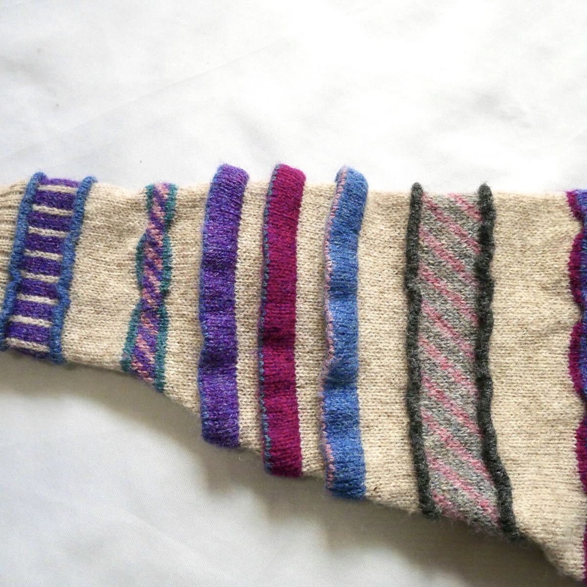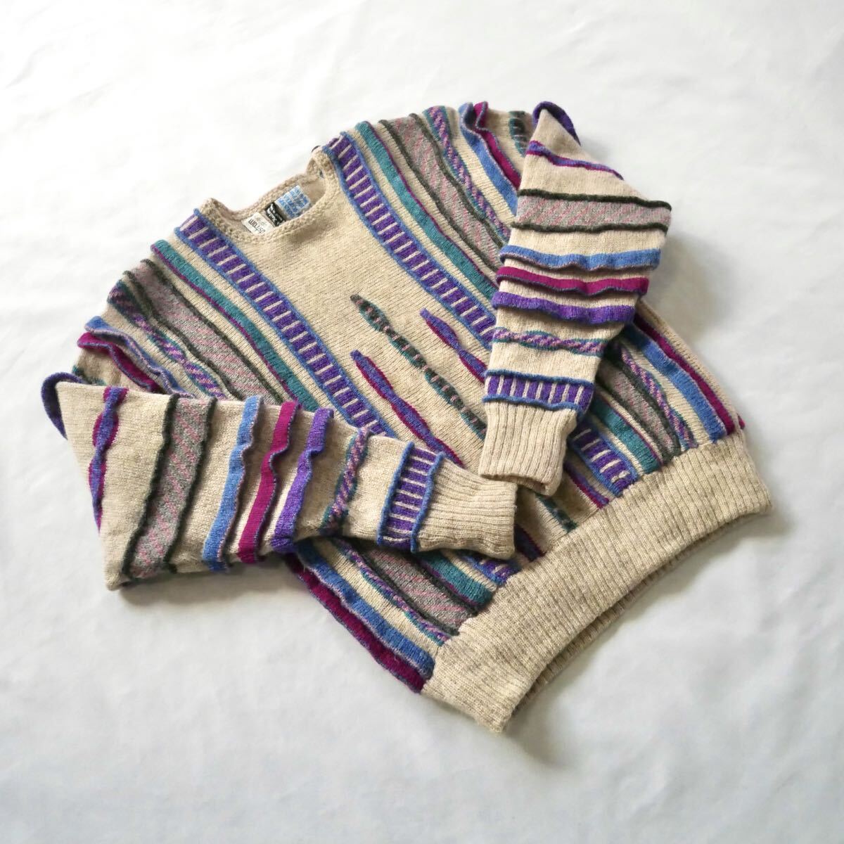 落ち着いたベージュベースにパープル、ピンク、ブルーと淡い色味がとても可愛いニットです。