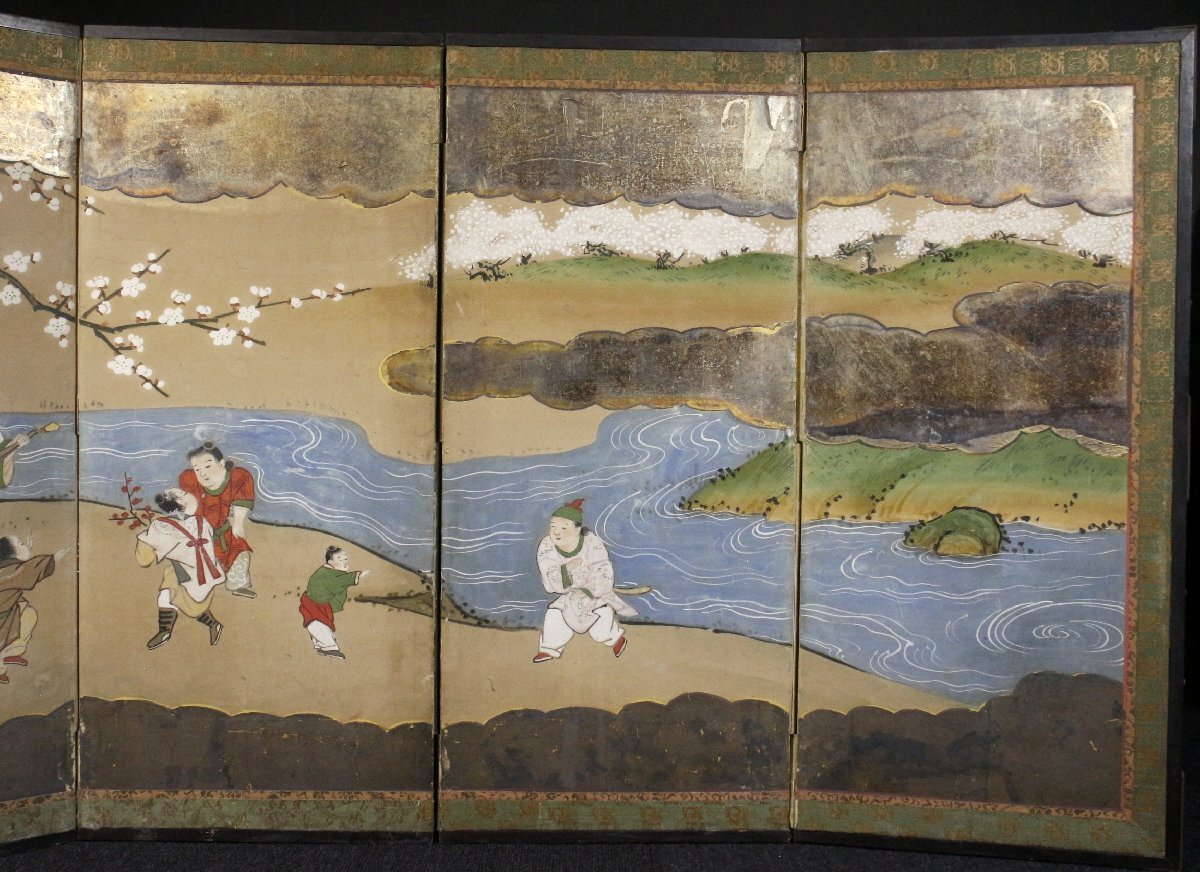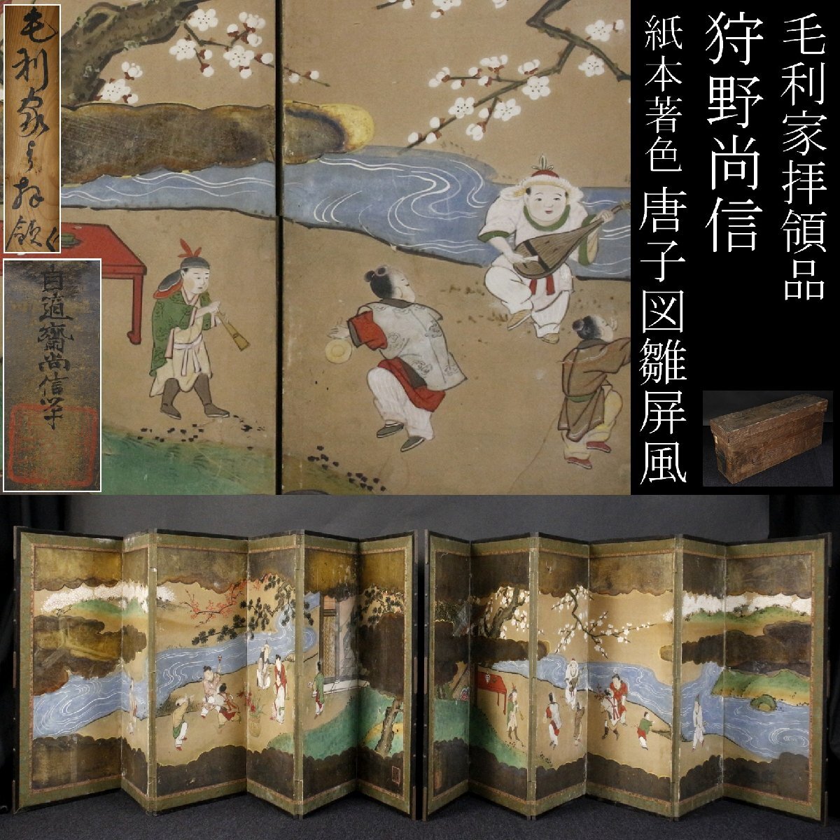 [.EE]25.10 25100303* * * 商品詳細 * * * ここでしか出逢うことのできない唯一の美をご紹介させて頂きます。 唐子たちが賑やかに遊ぶ様が描かれた雛屏風のご紹介です。 画面の隅々まで気の配られた見事な仕上がりで、 豊かな自然が豊富な色彩で描かれています。 子どもの健やかな成長を願う想いが伝わって来るかのような豪華なお品です。 箱には毛利家拝領とあり、代々に渡り大切に受け継がれてきたことも伺えます。 素晴らしい時代の逸品をこの機会に是非お手元にてご堪能下さい。 狩野尚信 江戸前期の画家。木挽町狩野家初代。京都生。 孝信の次男、探幽の弟、安信の兄。初名は一信、のち家信、通称を主馬。 薙髪して自適斎と号し、幕府の奥絵師となり、多くの障壁画を描く。 山水画に優れ、情緒ある作品を残した。 慶安3年(1650)歿、43才。 ■商品内容/屏風 一双、時代箱 ■サイズ/横171cm×高63cm 収納時厚み6.5㎝ 箱:横68cm×高30cm×奥行18㎝ ■状態/経年による傷み、スレ、キズ、ヤケ、シミ、剥げ、破れ、穴、サビ、 箱にスレ、キズ、割れ、欠けがございます。 ※写真にてご確認、ご了承の上ご入札下さい。 ![]() !かんたん決済 * * * 発送詳細 * * * 入金確認後3営業日以内に発送致します。 ※直接引き取りも可能です。 60~160サイズにつきましては 佐川急便、ゆうパックのどちらかで発送いたします。 ゆうパック発送の場合、弊社の発送日から追跡サービスに問合せ番号が反映されるまで 約1日ほどお時間がかかりますのでご了承下さい。 * * * 注意事項 * * * 運送中の破損があった場合は速やかに当社までご連絡下さい。 保険を利用するのに受取連絡後に運送会社による現場での破損状況確認が必要となります。 勝手に返送されますと保険の適用外となりますのでご注意ください。 * * * * * * お問い合わせ:082-236-8669 |