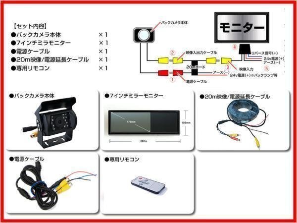 | ■24V車対応の液晶モニター + バックカメラセット 液晶モニターとバックカメラのセットなので、こちらのセットだけで バックカメラをご利用出来ます。 ■7インチミラー液晶モニター 7インチの液晶なので、バックカメラ用としては、満足出来る大きさです。 また、2系統の入力端子を装備しているので、DVDプレーヤー等も別途接続出来ます。 ■赤外線LED搭載バックカメラ 赤外線LED搭載モデルのため、視認性が低下し易い夜間でも一定の視認性を確保出来ます。 また、広角カメラなので視認性も高く、より確実な確認が出来ます。 ■ノイズカットフィルター付き 付属のケーブルにノイズカットフィルターを装着した状態でお届けします。 ※ノイズカットを100%行なうものではございません。 |