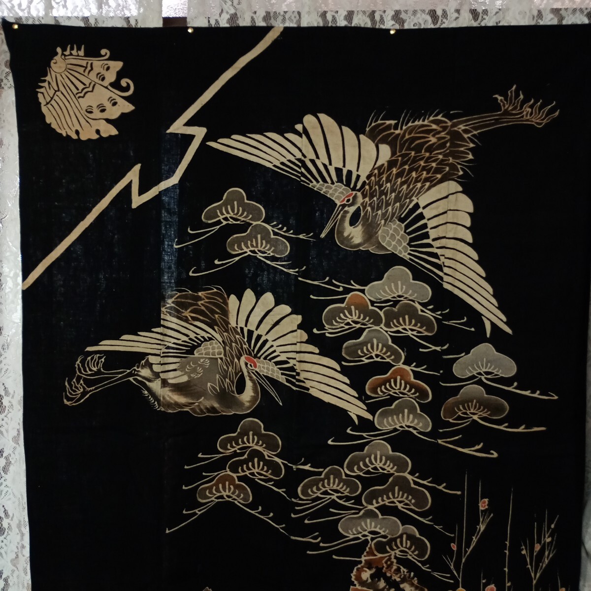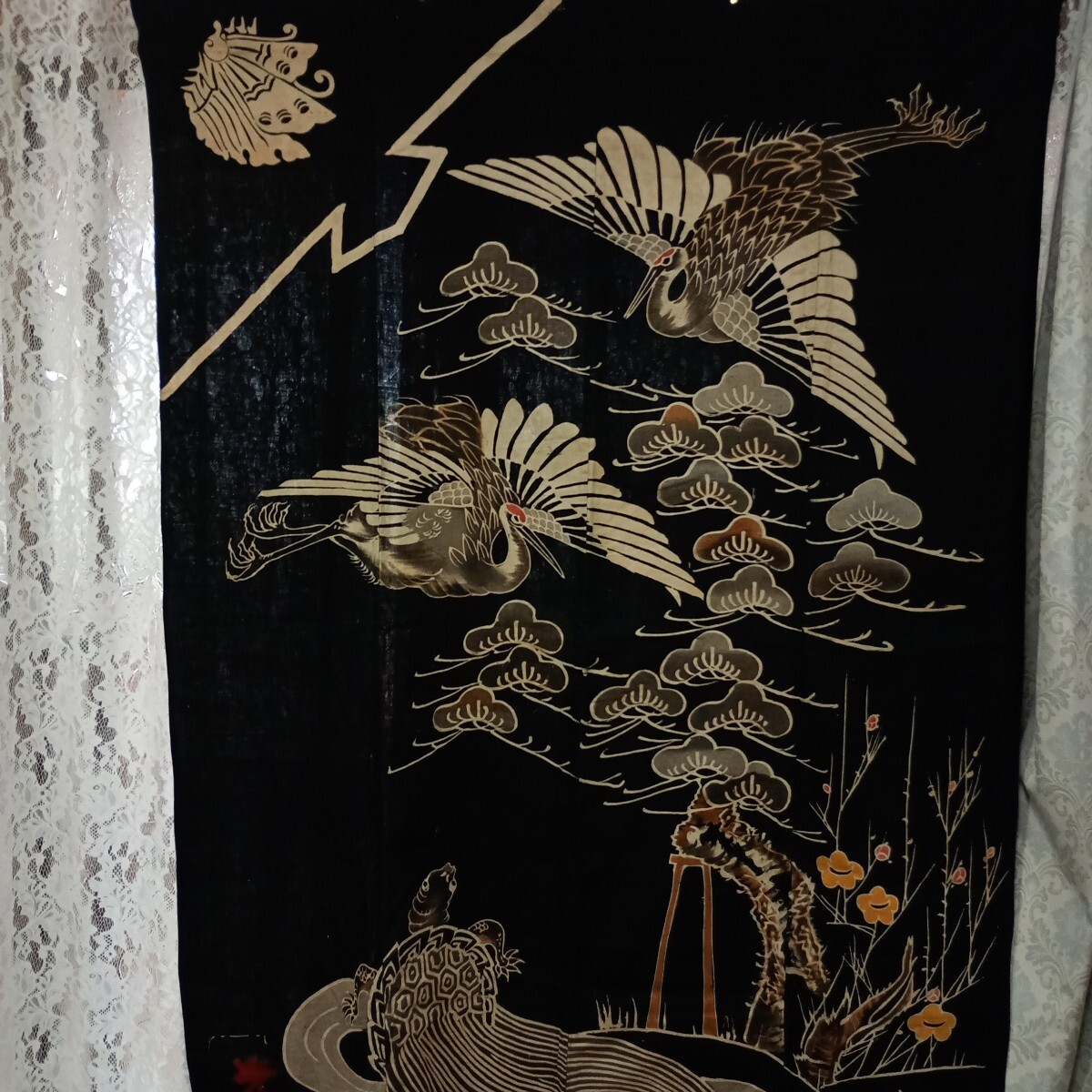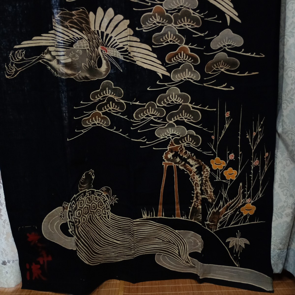古手の筒描きで松竹梅に鶴亀の図です。古い色合いの良い筒描きですが、左下隅に写真の様に朱の塗料で名前が書き加えられており、傷になっていますので、リメイク用としてご利用いただける方に提供したいと思います。コートやお洋服、暖簾や法被等にリメイクされては如何でしょうか。左下隅の傷以外は傷はありませんので素敵な作品に仕上げて、お楽しみ下さい。生地は中厚厚手です。
