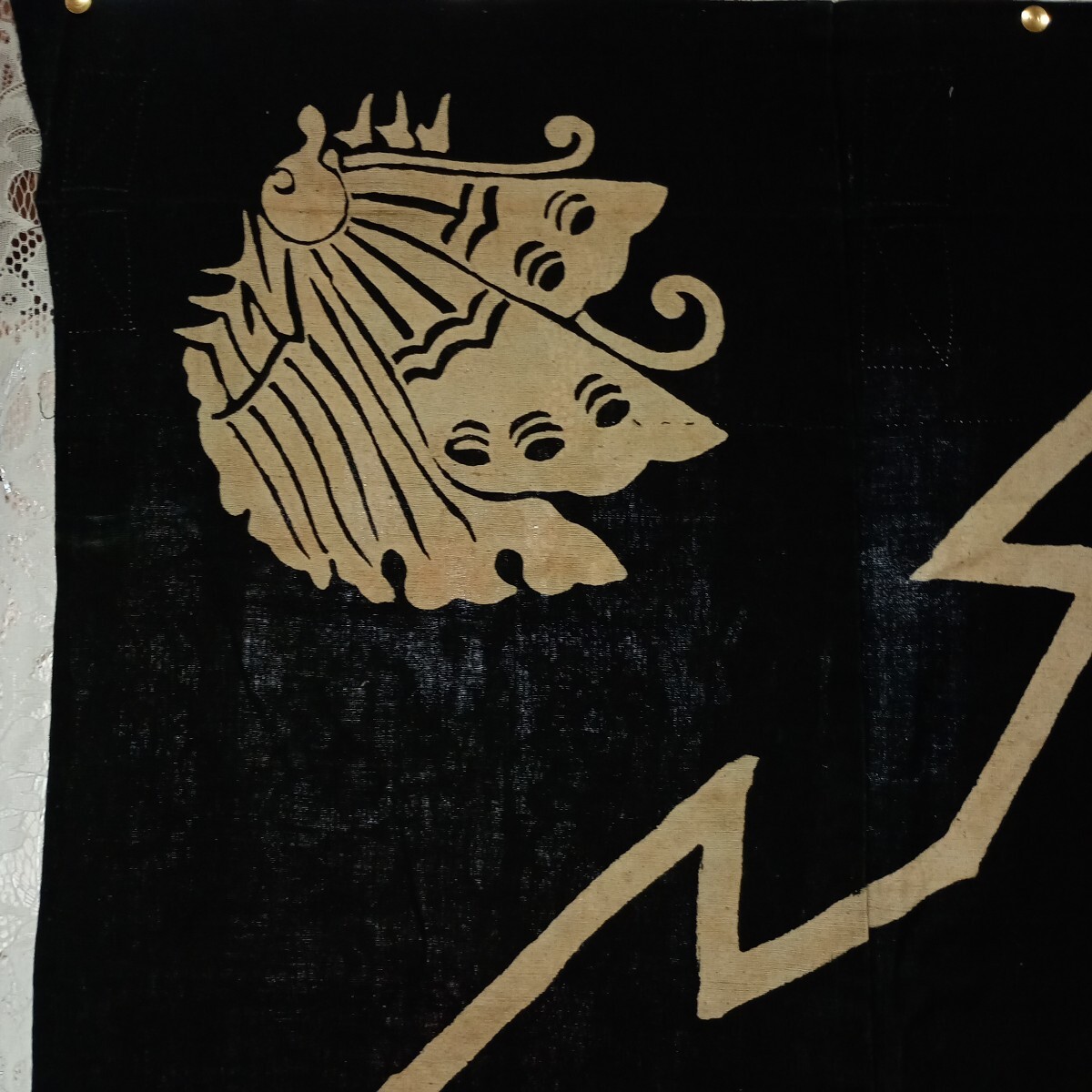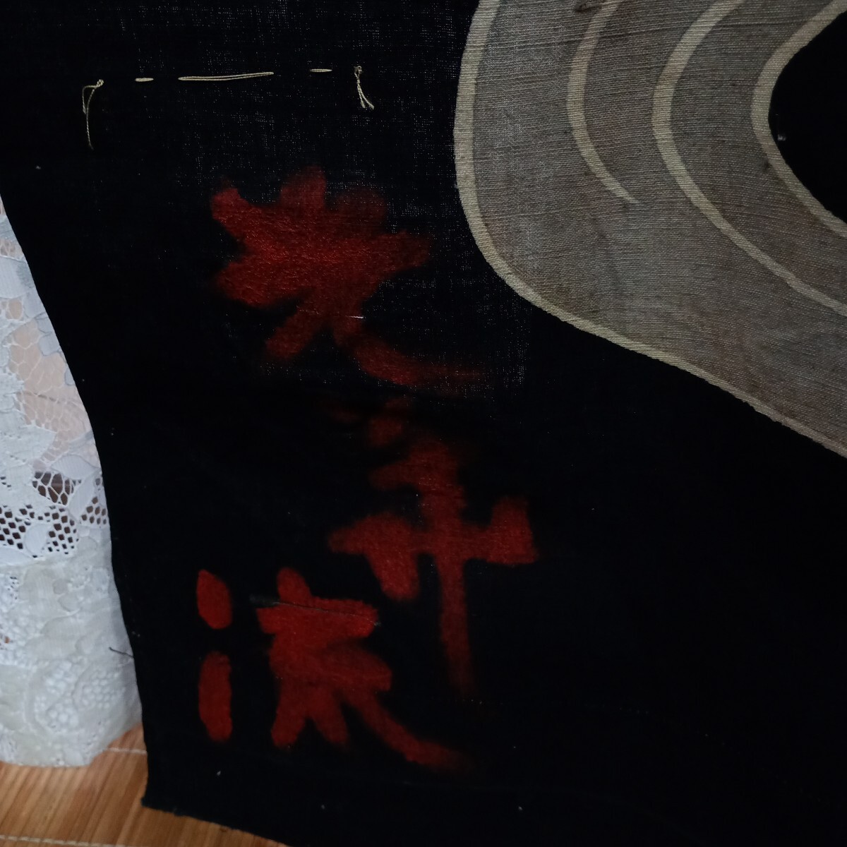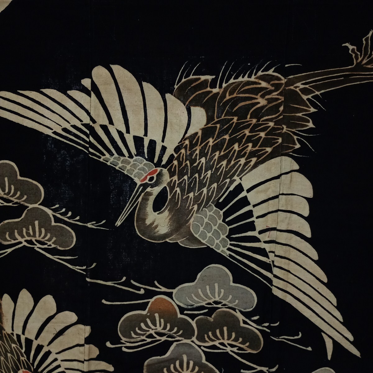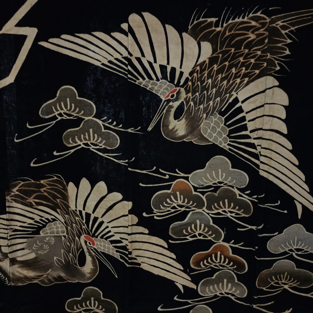 古手の筒描きで松竹梅に鶴亀の図です。古い色合いの良い筒描きですが、左下隅に写真の様に朱の塗料で名前が書き加えられており、傷になっていますので、リメイク用としてご利用いただける方に提供したいと思います。コートやお洋服、暖簾や法被等にリメイクされては如何でしょうか。左下隅の傷以外は傷はありませんので素敵な作品に仕上げて、お楽しみ下さい。生地は中厚厚手です。