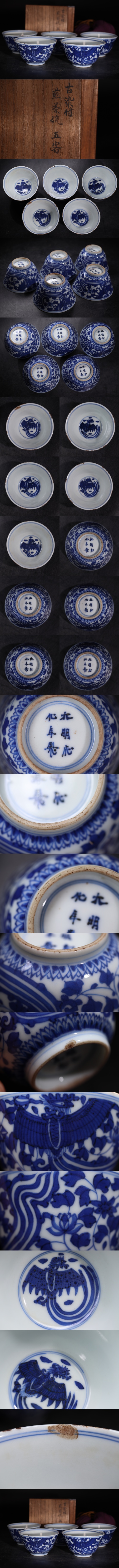 | 大明成化年製 底款 古染付 鳳凰図 煎茶碗 五客 木箱付 / 明 成化 中国美術 茶器 煎茶道具 .G3033 |