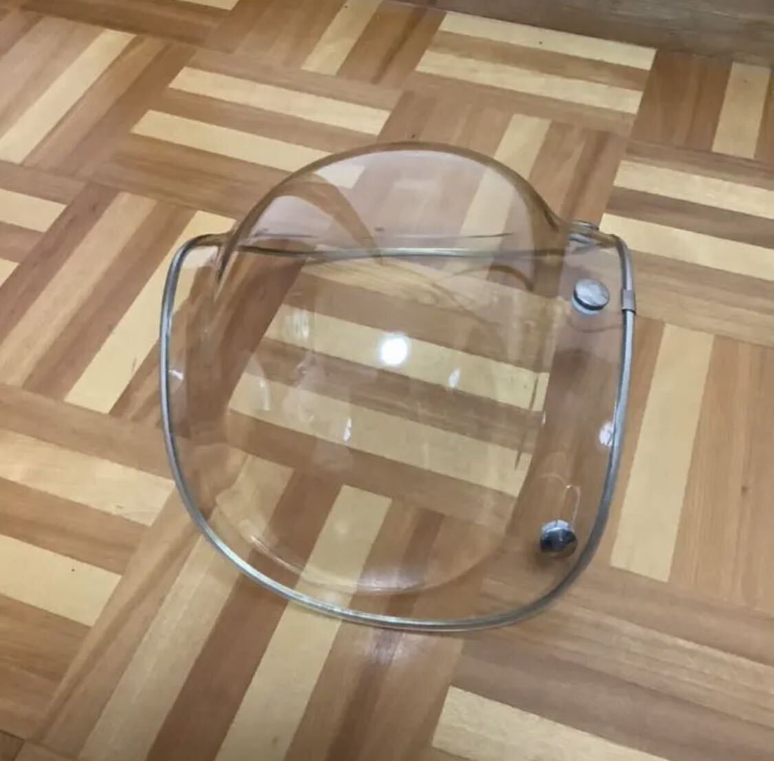 デッドストックのバブルシールド アメリカ GRAN PRIX製です。スライド式の3スナップボタンですのでボタン付きのヘルメットであれば装着可能です。当時の袋に入ったままの状態ですが、経年による特有の匂いがあります。匂いは使っているうちに消えると思います。写真はヘルメットへの装着列です。