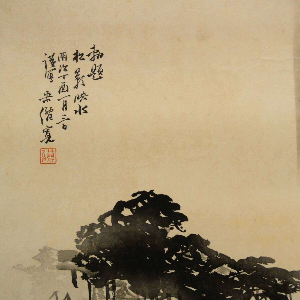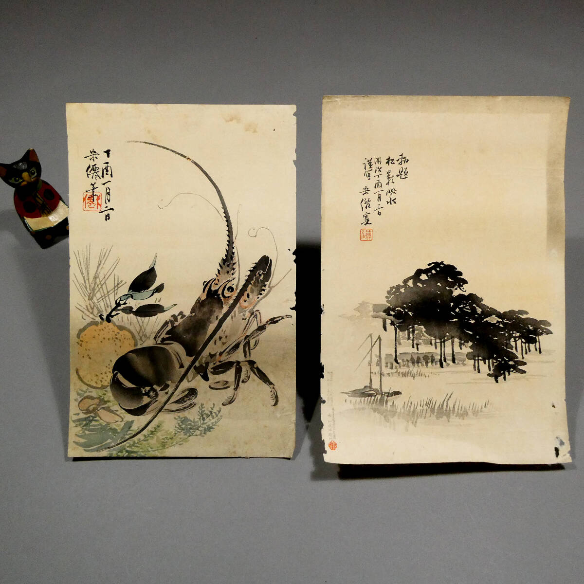 ■ 久保田米僊 新年寿ぐ 明治丁酉一月 木版画 2点一括 花鳥 山水画 「勅題 松影映水」 伊勢海老と山の幸 ■