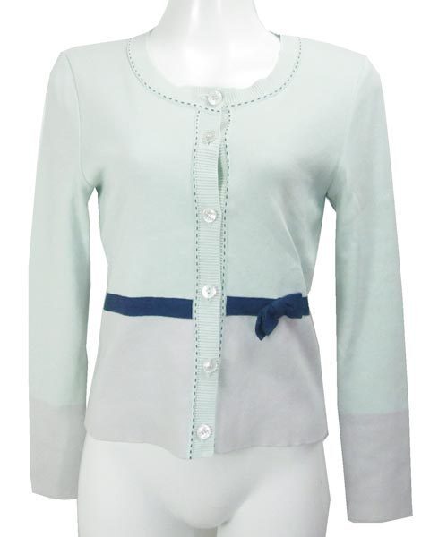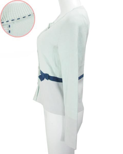 | 爽やかなお色使いの上品なカーディガン。ウエストにはリボンがついていて、フェミニンなデザイン。ダークカラーのボトムスにも、淡めなお色にもあわせて頂けてあわせやすいお色使いです。ボタンにはロゴが入っていて、ブランドアピールがあります。 |