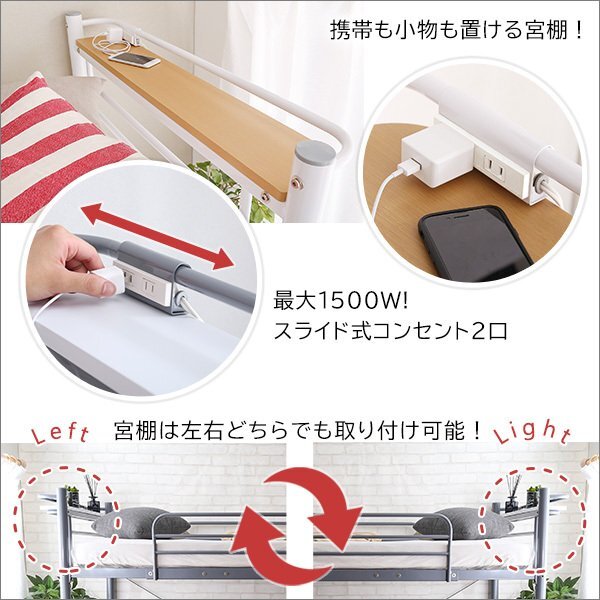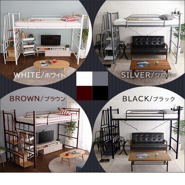 | 【ポイント】 ①階段付きでより快適にご使用頂けるロフトベッドです。 ②コンセント付きの宮棚が付いて、ハイタイプ・ミドルタイプに高さ調整ができます。 ③丈夫なパイプを使用しているので安心、安全です。 ④ベッド下のスペースはお好みでアレンジが可能です。 |
