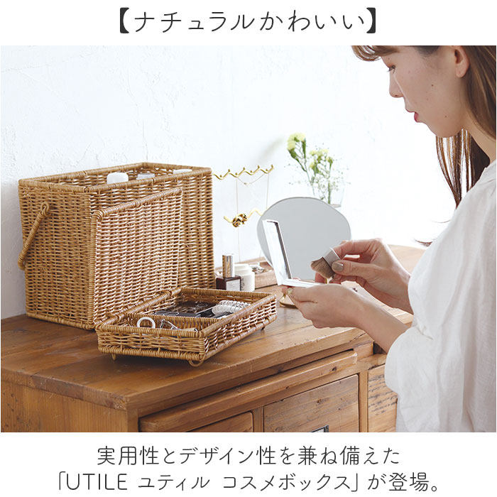 | 商品説明 | ・・【ナチュラルかわいい】 ・実用性とデザイン性を兼ね備えた「UTILE ユティル コスメボックス」が登場。 ・【まるで天然素材】 ・天然素材に見えるポリプロピレンとポリエチレンチューブ素材を使った手編みのバスケット。 ・【便利な2段式収納】 ・取り外し可能な2段式で、分けて使えるのが嬉しい! ・【細かい物の収納に】 ・仕切り付きの上段にはアイシャドウやチーク、ブラシなどの小物収納にぴったり◎ ・【ボトル類もスッキリ】 ・下段はスプレー缶や化粧水など、高さのある物の収納が可能◎※高さ18cmまでのものが収納可能。 ・【水洗いできる】 ・水や湿気に強く、汚れても水で洗えるのが嬉しいポイント。※濡れた状態で長時間放置しないでください。 ・【持ち運びしやすい】 ・持ち手付きで持ち運びもらくらく♪リビングや洗面所など、さまざまな場所で使える。 ・【自由な使い方】 ・メイクボックス以外にも、ソーイングボックスやお道具箱としてもおすすめ♪ ・【空間に馴染むデザイン】 ・飽きの来ないシンプルなデザインだから、どんなインテリアにも素敵にマッチ。 |