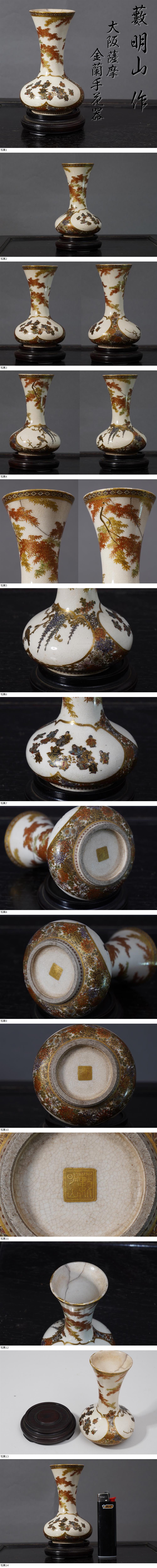 明治~大正期に輸出用に製作された大阪薩摩の代表的な陶芸家「藪明山」作の花器です。 【藪明山】 藪 明山は(1853~1934)は画家・藪 長水(1813~1867)の子として、大坂・長堀に生まれました。明治新政府発足後の大阪で、欧米諸国向けの輸出品として注目されていた「薩摩焼」の製作・販売をおこなった近代を代表する工芸家であり起業家です。明山は明治13年(1880)から昭和初期頃まで北区中之島に「陶器描画場」を経営しました。明治時代には日本各地でさまざまな「薩摩焼」が生産されましたが、明山工房製の「薩摩焼」はその上絵付の細密さで他の追随を許さず、「明山薩摩」あるいは「明山焼」などと呼ばれて、国内外の博覧会、特に欧米で開催された万国博覧会で大好評を博しました。 高さ(台座含まず)約9センチの小ぶりな作品ながら、首には朱と金彩が美しい紅葉図、 胴には片面には花鳥画、反対面には子供達が歌留多や囲碁で遊ぶ様が精緻に描かれております。 腰~底には菊花がびっしりと描かれた至極の逸品です。 非常に貴重な逸品です。 この機会に是非! サイズ(約):高さ9cm 幅5cm 台座付き |