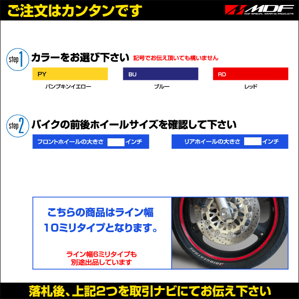 | 落札後に取引ナビでお届け先とご注文内容をご記入頂く案内をお送り致します。(土日祝日落札の場合は翌営業日のご連絡になります) ご希望の前後ホイールサイズとカラーをお知らせ頂きますので、あらかじめ画像2枚目を参照しご希望内容を書き留めておいて下さい。 リムストライプゲージを同時に購入したい場合は、【 エムディーエフオフィシャル リムストライプゲージ 】で検索しそちらも落札して まとめて取引をご利用ください。 グラフィックキットなども同時に購入したい場合は、【 エムディーエフオフィシャル 】が出品している商品を落札頂きまとめて取引を ご利用ください。 まとめて取引の詳細はこちらをご覧ください。 |